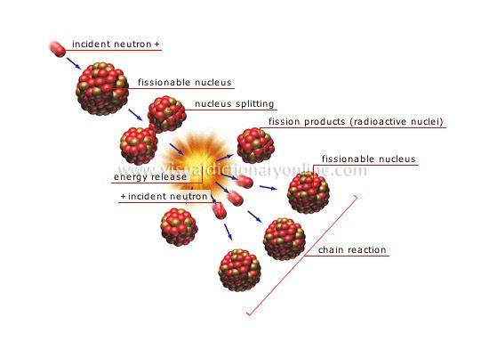 a nuclear reaction in which a massive nucleus splits into smaller nuclei with the simultaneous release of energy