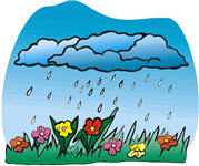 1 rain - water that falls from the sky: rain (noun U); verb: rain It looks like rain again today. ◎ a long period of rain ◎ Is it still raining? ◎ It hardly ever rains in my country. - to come down from the sky: fall* The rain was falling steadily. - when rain falls slowly off sth like the roof of a building or the leaves of a tree, it drips The rain was dripping down the back of my neck. - one small piece of rain: raindrop - a white or grey mass of water in the sky which rain can fall from: cloud (noun C/U) ※ more on clouds SKY - if it is raining, the weather is wet a wet day ◎ a wet summer - a period when it rains is rainy a rainy day ◎ the rainy season - a short period of rain: shower; when there are showers, the weather is showery - the amount of rain that falls in a certain place within a certain period (for example, a year): rainfall (noun U) the average annual rainfall in Brazil - water that has fallen as rain: rainwater (noun U) - a small pool of rainwater on the ground: puddle - a mixture of earth and water on the ground: mud (noun U); after it has been raining the ground may be muddy ※ just a little rain - just a little rain: light rain; light rain with a lot of small drops: drizzle (noun U); verb: drizzle 'Is it still raining?' 'Not really, just drizzling.' - a very little rain: a spot of rain I just felt a few spots of rain. ※ a lot of rain - a lot of rain: heavy rain; very heavy rain: torrential rain; hard rain with a strong wind: driving rain - to rain a lot: rain hard/heavily, pour (with rain), pour down It started to rain heavily and we were soon absolutely soaked. ◎ We can't go out now - it's pouring! - a very heavy shower of rain: downpour - a period of heavy rain and strong wind: storm; adjective: stormy stormy weather - (especially after heavy rain) a large amount of water that covers an area that is normally dry: flood Heavy rain has caused floods in low-lying areas. ※ more on storms STORM ※ when it is very cold - cold rain that is similar to snow: sleet (noun U); verb: sleet - hard frozen rain that falls as small pieces of ice: hail (noun U); verb: hail; a heavy shower of hail: hailstorm; a piece of hail: hailstone