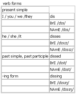 dis [dis disses dissed dissing] (also diss)BrE [dɪs] NAmE [dɪs] verb (-ss-)~ sb (informal, especially NAmE)