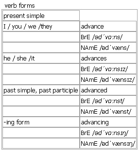 ad·vance [advance advances advanced advancing] noun, verb, adjective BrE [ədˈvɑːns] NAmE [ədˈvæns] noun FORWARD MOVEMENT 1. countable the forward movement of a group of people, especially armed forces • We feared that an advance on the capital would soon follow. •enemy advances DEVELOPMENT 2. countable, uncountable ~ (in sth) progress or a development in a particular activity or area of understanding •recent advances in medical science • We live in an age of rapid technological advance. •major advances in the field of physics MONEY 3. countable, usually singular money paid for work before it has been done or money paid earlier than expected • They offered an advance of £5 000 after the signing of the contract. •She asked for an advance on her salary. •The bank will give you an advance of 95% of the purchase price. SEXUAL 4. advancesplural attempts to start a sexual relationship with sb •He had made advances to one of his students. •She rejected his sexual advances. PRICE INCREASE 5. countable ~ (on sth) (business)an increase in the price or value of sth •Share prices showed significant advances. Word Origin: Middle English: from Old French avance (noun), avancer (verb), from late Latin abante ‘in front’, from ab ‘from’ + ante ‘before’. The initial a- was mistakenly assimilated to ad- in the 16th cent. Thesaurus: advance noun C, U •recent advances in medical science progress • • development • • breakthrough • (a/an) advance/progress/development/breakthrough in sth (a) scientific/technical/technological/political advance/progress/development/breakthrough (a/an) economic/social advance/progress/development Collocations: War and peace Starting a war declare/make/wage war (on sb/sth) go to war (against/with sb) cause/spark/provoke/foment/quell unrest incite/lead/crush/suppress a revolt/rebellion launch/mount/carry out a surprise/terrorist attack prevent/halt/represent an escalation of the conflict be torn apart by/be on the brink of civil war enter/invade/occupy sb's territory lead/launch/resist/repel an invasion Military operations adopt/develop/implement/pursue a military strategy carry out/execute/perform military operations/manoeuvres/(especially US) maneuvers send/deploy/station/pull back/withdraw troops go on/fly/carry out a reconnaissance/rescue mission train/equip/deploy army/military/combat units lead/launch/conduct a raid/a surprise attack/an (air/airborne/amphibious) assault (on sb) employ/use guerrilla tactics conduct/wage biological/guerrilla warfare fight/crush/defeat the rebels/the insurgency suffer/inflict a crushing defeat achieve/win a decisive victory halt/stop the British/German/Russian advance order/force a retreat Fighting join/serve in the army/navy/air force be/go/remain/serve on active duty serve/complete/return from a tour of duty be sent to the front (line) attack/strike/engage/defeat/kill/destroy the enemy see/report/be engaged in heavy fighting call for/be met with armed resistance come under heavy/machine-gun/mortar fire fire a machine-gun/mortar shells/rockets (at sb/sth) shoot a rifle/a pistol/bullets/missiles launch/fire a cruise/ballistic/anti-tank missile use biological/chemical/nuclear weapons inflict/suffer/sustain heavy losses/casualties be hit/killed by enemy/friendly/artillery fire become/be held as a prisoner of war Civilians in war harm/kill/target/protect innocent/unarmed civilians cause/avoid/limit/minimize civilian casualties/collateral damage impose/enforce/lift a curfew engage in/be a victim of ethnic cleansing be sent to an internment/a concentration camp accept/house/resettle refugees fleeing from war fear/threaten military/violent reprisals commit/be accused of war crimes/crimes against humanity/genocide Making peace make/bring/win/achieve/maintain/promote peace call for/negotiate/broker/declare a ceasefire/a temporary truce sign a ceasefire agreement call for/bring/put an end to hostilities demand/negotiate/accept the surrender of sb/sth establish/send (in) a peacekeeping force negotiate/conclude/ratify/sign/accept/reject/break/violate a peace treaty Example Bank: •He was paid £5 000 as an advance on royalties. •Hindu science made great advances in astronomy and mathematics. •Recent years have seen significant advances in our understanding of the human genome. •The design incorporates the most recent technological advances. •The general ordered an advance to the front line. •The publishers have paid me an advance. •The regiment made an advance on the enemy lines. •We need more money if we are to make any further advances in this area of science. •We try to plan well in advance. •You'll get the agenda in advance of the committee meeting. •an advance of $10 000 •an advance on the existing techniques •an advance towards a better understanding of God •rapid advances in science and technology •the Russian advance towards Berlin •two major advances in medical science •two major advances in orthopaedic medicine •At this time there were a number of major advances in the field of physics. •Enemy advances had forced them to retreat into the mountains. •The bank will give you an advance of 95% of the purchase price. •Their advance on the city seemed unstoppable. Idiom: ↑in advance verb MOVE FORWARD 1. intransitive to move forward towards sb/sth, often in order to attack or threaten them or it • The troops were finally given the order to advance. • They had advanced 20 miles by nightfall. •the advancing Allied troops •~ on/towards sb/sth The mob advanced on us, shouting angrily. •She closed the door firmly and advanced towards the desk. compare ↑retreat DEVELOP 2. intransitive, transitive if knowledge, technology, etc. advances, it develops and improves • Our knowledge of the disease has advanced considerably over recent years. •~ sth This research has done much to advance our understanding of language learning. HELP TO SUCCEED 3. transitiv