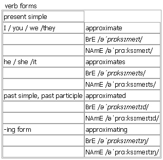 ap·proxi·mate AW [approximate approximates approximated approximating] adjective, verb adjective BrE [əˈprɒksɪmət] ; NAmE [əˈprɑːksɪmət] (abbr.approx) almost correct or accurate, but not completely so •an approximate number/total/cost • The cost given is only approximate. • Use these figures as an approximate guide in your calculations. Opp: ↑exact Word Origin: late Middle English (in the adjectival sense ‘close, similar’): from late Latin approximatus, past participle of approximare, from ad- ‘to’ + proximus ‘very near’. The verb (originally meaning ‘bring close’) arose in the mid 17th cent.; the current use as an adjective dates from the early 19th cent. Thesaurus: approximate adj. •The cost given is only approximate. rough • • imprecise • • inexact • • vague • • general • • broad • |AmE ballpark • Opp: exact a/an approximate/rough/vague/general/broad idea a/an approximate/rough/ballpark figure/estimate Approximate or rough? Approximate most often describes the number, amount, cost, etc. of sth. Rough more often describes an estimate, idea or guess of sth: •Construction was completed at an approximate cost of $4.1 million. • There were about 20 people there, at a rough guess. Rough, but not approximate can describe a piece of writing or a drawing: •a rough draft/sketch of sth ✗ an approximate draft/sketch of sth Example Bank: •Construction was completed at an approximate cost of $4.1 million. verb BrE [əˈprɒksɪmeɪt] ; NAmE [əˈprɑːksɪmeɪt] (formal) 1. transitive, intransitive to be similar or close to sth in nature, quality, amount, etc, but not exactly the same •~ sth The animals were reared in conditions which approximated the wild as closely as possible. •The total cost will approximate £15 billion. •~ to sth His story approximates to the facts that we already know. 2. transitive ~ sth to calculate or estimate sth fairly accurately •a formula for approximating the weight of a horse Verb forms: Word Origin: late Middle English (in the adjectival sense ‘close, similar’): from late Latin approximatus, past participle of approximare, from ad- ‘to’ + proximus ‘very near’. The verb (originally meaning ‘bring close’) arose in the mid 17th cent.; the current use as an adjective dates from the early 19th cent. Example Bank: •The total cost will approximate £5 billion.
