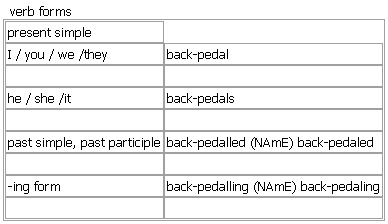 ˌback-ˈpedal [back-pedal back-pedals back-pedalled back-pedaled back-pedalling back-pedaling] BrE NAmE verb (-ll-, NAmE -l-) 1. intransitive ~ (on sth) to change an earlier statement or opinion; to not do sth that you promised to do •The protests have forced the government to back-pedal on the new tax. 2. intransitive to ↑pedal backwards on a bicycle; to walk or run backwards Verb forms: