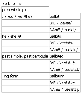 bal·lot [ballot ballots balloted balloting] noun, verb BrE [ˈbælət] NAmE [ˈbælət]