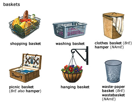 1. a container for holding or carrying things. Baskets are made of thin strips of material that bends and twists easily, for example plastic, wire or ↑wicker