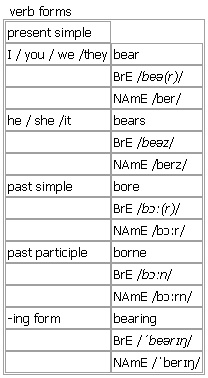 bear [bear bears bore bearing borne] verb, noun BrE [beə(r)] NAmE [ber] verb (boreBrE [bɔː(r)] ; NAmE [bɔːr] borneBrE [bɔːn] ; NAmE [bɔːrn] ) ACCEPT/DEAL WITH 1. transitive (used with can/could in negative sentences and questions)to be able to accept and deal with sth unpleasant Syn: ↑stand •~ sth The pain was almost more than he could bear. • She couldn't bear the thought of losing him. •~ doing sth I can't bear having cats in the house. •He can't bear being laughed at. •~ to do sth He can't bear to be laughed at. •How can you bear to eat that stuff? •~ sb doing sth I can't bear you doing that. NOT BE SUITABLE 2. transitive not ~ to not be suitable for sth •~ sth Her later work does not bear comparison with her earlier novels (= because it is not nearly as good). •The plan won't bear close inspection (= it will be found to be unacceptable when carefully examined). •~ doing sth The joke doesn't bear repeating (= because it is not funny or may offend people). •His sufferings don't bear thinking about (= because they are so terrible). BE RESPONSIBLE FOR STH 3. transitive ~ sth (formal)to take responsibility for sth • She bore the responsibility for most of the changes. • Do parents have to bear the whole cost of tuition fees? •You shouldn't have to bear the blame for other people's mistakes. NEGATIVE FEELING 4. transitive to have a feeling, especially a negative feeling •~ sth (against/towards sb) He bears no resentment towards them. •He's borne a grudge against me ever since that day. •~ sb sth He's borne me a grudge ever since that day. •She bore him no ill will. SUPPORT WEIGHT 5. transitive ~ sth to support the weight of sb/sth • The ice is too thin to bear your weight. SHOW 6. transitive ~ sth (formal)to show sth; to carry sth so that it can be seen • The document bore her signature. •He was badly wounded in the war and still bears the scars. •She bears little resemblance to (= is not much like) her mother. •The title of the essay bore little relation to (= was not much connected with) the contents. NAME 7. transitive ~ sth (formal)to have a particular name •a family that bore an ancient and honoured name CARRY 8. transitive ~ sb/sth (old-fashioned or formal)to carry sb/sth, especially while moving •three kings bearing gifts YOURSELF 9. transitive ~ yourself well, etc. (formal)to move, behave or act in a particular way •He bears himself (= stands, walks, etc.) proudly, like a soldier. •She bore herself with dignity throughout the funeral. CHILD 10. transitive (formal)to give birth to a child •~ sth She was not able to bear children. •~ sb sth She had borne him six sons. OF TREES/PLANTS 11. transitive ~ sth (formal)to produce flowers or fruit TURN 12. intransitive ~ (to the) left, north, etc. to go or turn in the direction mentioned •When you get to the fork in the road, bear right. more at bear, take, etc. the brunt of sth at ↑brunt, have a (heavy) cross to bear at ↑cross n., grin and bear it at ↑grin v., bear/keep sb/sth in mindbear/keep in mind (that…) at ↑mind n., bear/give witness (to sth) at ↑witness n. Verb forms: Word Origin: v. Old English beran Germanic Indo-European Sanskrit bharati Greek pherein Latin ferre n. Old English bera West Germanic Dutch beer German Bär Thesaurus: bear verb 1. I, T (not used in the progressive tenses) •How can you bear this awful noise? stand • • take • |especially written tolerate • |especially spoken put up with sb/sth • |formal endure • (can't/not) bear/stand/endure doing sth (can't/not) bear/stand/put up with sb/sth doing sth bear/stand/put up with/endure pain sb can hardly bear/stand sth Bear or stand? Bear is slightly stronger and more formal than stand. Stand is used with can/could in negative statements and questions, but not in positive statements: •She bore it with her usual patience. ✗ She stood it with her usual patience. 2. can't bear T (not used in the progressive tenses) •She couldn't bear the thought of losing him. can't stand • • hate • • loathe • • detest • can't bear/can't stand/hate/loathe/detest doing sth can't bear/hate to do sth can't bear/can't stand/hate it when… 3. T (formal) •She had to bear the blame for his mistakes. accept • • take • • shoulder • • carry • |formal assume • bear/accept/take/shoulder/carry/assume sth for sb/sth bear/accept/take/shoulder/carry/assume the responsibility bear/accept/take/shoulder/carry the blame 4. T •The ground was too soft to bear his weight. hold • • support • • carry • bear/hold/support/carry the weight of sb/sth Bear or hold? Bear is slightly more formal and can also be used figuratively: •He seemed unable to bear the weight of responsibility. ✗ He seemed unable to hold the weight of responsibility. Synonyms: hate dislike • can't stand • despise • can't bear • loathe • detest These words all mean to have a strong feeling of dislike for sb/sth. hate • to have a strong feeling of dislike for sb/sth. Although hate is generally a very strong verb, it is also commonly used in spoken or informal English to talk about people or things that you dislike in a less important way, for example a particular type of food: ▪ He hates violence in any form. ◇ ▪ I've always hated cabbage. dislike • (rather formal) to not like sb/sth. Dislike is a rather formal word; it is less formal, and more usual, to say that you don't like sb/sth, especially in spoken English: ▪ I don't like it when you phone me so late at night. can't stand • (rather informal) used to emphasize that you really do not like sb/sth: ▪ I can't stand his brother. ◇ ▪ She couldn't stand being kept waiting. despise • to dislike and have no respect for sb/sth: ▪ He despised himself for being so cowardly. can't bear • used to say that you dislike sth so much that you cannot accept or deal with it: ▪ I can't bear having cats in the house. can't stand or c