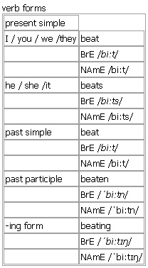 beat [beat beats beating beaten] verb, noun, adjective BrE [biːt] NAmE [biːt] verb (beat, beatenBrE [ˈbiːtn] ; NAmE [ˈbiːtn] ) IN GAME 1. transitive ~ sb (at sth) to defeat sb in a game or competition • He beat me at chess. • Their recent wins have proved they're still the ones to beat (= the most difficult team to beat). CONTROL 2. transitive ~ sth (informal)to get control of sth Syn: ↑defeat • The government's main aim is to beat inflation. BE TOO DIFFICULT 3. transitive (informal)to be too difficult for sb Syn: ↑defeat •~ sb a problem that beats even the experts •~ sb why, how, etc… It beats me (= I don't know) why he did it. •What beats me is how it was done so quickly (= I don't understand how). BE BETTER 4. transitive ~ sth (rather informal)to do or be better than sth •Nothing beats home cooking. •You can't beat Italian shoes. •They want to beat the speed record (= go faster than anyone before). AVOID 5. transitive ~ sth (informal)to avoid sth •If we go early we should beat the traffic. •We were up and off early to beat the heat. HIT 6. intransitive, transitive to hit sb/sth many times, usually very hard •+ adv./prep. Somebody was beating at the door. • Hailstones beat against the window. •~ sth Someone was beating a drum. •~ sth + adv./prep. She was beating dust out of the carpet (= removing dust from the carpet by beating it). •~ sb At that time children were regularly beaten for quite minor offences (= a punishment). •~ sb + adv./prep. An elderly man was found beaten to death. •The prisoners were beaten into submission (= they were beaten until they did what was wanted). •~ sb + adj. They beat him unconscious (= hit him until he became unconscious). OF HEART/DRUMS/WINGS 7. intransitive, transitive to make, or cause sth to make, a regular sound or movement • She's alive— her heart is still beating. • We heard the drums beating. •The bird was beating its wings (= moving them up and down) frantically. MIX 8. transitive to mix sth with short quick movements with a fork, etc •~ sth (up) Beat the eggs up to a frothy consistency. •~ A and B together Beat the flour and milk together. SHAPE METAL 9. transitive to change the shape of sth, especially metal, by hitting it with a hammer, etc •~ sth (out) (into sth) beaten silver •The gold is beaten out into thin strips. •~ sth + adj. The metal had been beaten flat. MAKE PATH 10. transitive ~ sth (through, across, along, etc. sth) to make a path, etc. by walking somewhere or by pressing branches down and walking over them •a well-beaten track (= one that has been worn hard by much use) •The hunters beat a path through the undergrowth. more at (beat sb) black and blue at ↑black adj., beat/knock the (living) daylights out of sb at ↑daylights, beat/bang the drum (for sb/sth) at ↑drum n., beat/kick (the) hell out of sb at ↑hell Verb forms: Word Origin: Old English bēatan, of Germanic origin. Thesaurus: beat verb 1. T •He beat me at chess. defeat • • get the better of sb • |especially BrE, informal thrash • |AmE, informal whip • |written overcome • • rout • • trounce • |formal best • • prevail • |literary vanquish • beat/defeat/thrash/rout/trounce sb by 10 points/4 goals, etc. beat/defeat/get the better of/thrash/whip/overcome/rout/trounce/vanquish an opponent beat/defeat/overcome/rout/vanquish an enemy Beat or defeat? You can use beat to talk about winning against one or several opponents in a competition or race; use defeat to talk about one opponent in a battle or contest •She won the 100 metres, beating a number of top Europeans. • He defeated the incumbent president. Beat is more common in spoken and defeat in written English. 2. I, T •beating a drum batter • • pound • • hammer • • pummel • • hit • • thump • • lash • • dash • beat/batter/pound/hammer/pummel/hit/lash sb/sth with sth beat/batter/pound/hammer/lash/dash sb/sth against sth beat/batter/pound/hammer/lash/dash sb to death the rain/wind/sea beats/batters/pounds/lashes/dashes (at) sth 3. I •Her heart began to beat faster. pulse • • throb • • pound • |written flutter • sb's heart beats/pulses/throbs/pounds/flutters sb's blood beats/pulses/throbs/pounds sb's pulse beats/throbs/pounds/flutters Beat, pulse or throb? Pulse and throb are stronger than beat but are not used to talk about drums. Music and pain can pulse or throb. Machines throb but don't pulse. 4. T •Beat the eggs until they are frothy. whisk • • whip • • stir • • mix • • blend • beat/whisk/stir/mix/blend sth into sth beat/whisk/stir A and B together beat/whisk/whip cream/eggs/egg whites Synonyms: beat batter • pound • lash • hammer These words all mean to hit sb/sth many times, especially hard. beat • to hit sb/sth a lot of times, especially very hard: ▪ Someone was beating at the door. ◇ ▪ A young man was found beaten to death last night. ◇ ▪ At that time, children were often beaten for quite minor offences ▪ (= as a punishment) ▪. batter • to hit sb/sth hard a lot of times, especially in way that causes serious damage: ▪ He had been badly battered around the head and face. ◇ ▪ Severe winds have been battering the coast. pound • to hit sb/sth hard a lot of times, especially in a way that makes a lot of noise: ▪ Heavy rain pounded on the roof. lash • to hit sb/sth with a lot of force: ▪ The rain lashed at the window. The subject of lash is often rain, wind, hail, sea or waves. hammer • to hit sb/sth hard a lot of times, in a way that is noisy or violent: ▪ He hammered the door with his fists. pound or hammer? There is not much difference in meaning between these two, but to pound is sometimes a steadier action. To hammer can be more violent and it is often used figuratively. to beat/batter/pound/lash/hammer sb/sth with sth to beat/batter/pound/lash/hammer against sth to beat/batter/pound/hammer on sth to be