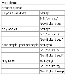 be·tray [betray betrays betrayed betraying] BrE [bɪˈtreɪ] NAmE [bɪˈtreɪ] verb 1. to give information about sb/sth to an enemy •~ sb/sth He was offered money to betray his colleagues. •~ sb/sth to sb For years they had been betraying state secrets to Russia. 2. ~ sb/sth to hurt sb who trusts you, especially by not being loyal or faithful to them •She felt betrayed when she found out the truth about him. •She betrayed his trust over and over again. •I have never known her to betray a confidence (= tell other people sth that should be kept secret). 3. ~ sth to ignore your principles or beliefs in order to achieve sth or gain an advantage for yourself •He has been accused of betraying his former socialist ideals. 4. to tell sb or make them aware of a piece of information, a feeling, etc, usually without meaning to Syn: give away •~ sth His voice betrayed the worry he was trying to hide. •~ yourself She was terrified of saying something that would make her betray herself (= show her feelings or who she was). Verb forms: Word Origin: Middle English: from ↑be- ‘thoroughly’ + obsolete tray ‘betray’, from Old French trair, based on Latin tradere ‘hand over’. Thesaurus: betray verb T (disapproving) •She betrayed my trust. •He betrayed his country. disapproving deceive • • cheat • • let sb down • • stab sb in the back • |informal, disapproving tell • • blab • |formal, often disapproving inform on sb • |BrE turn King's/Queen's evidence • |AmE turn State's evidence • |AmE, informal finger • |BrE, slang, disapproving grass • |informal, approving, especially journalism blow the whistle on sb • betray sb/blab/grass to sb tell/inform/grass/blow the whistle on sb feel betrayed/cheated/let down Synonyms: cheat fool • deceive • betray • take in • trick • con These words all mean to make sb believe sth that is not true, especially in order to get what you want. cheat • to make sb believe sth that is not true, in order to get money or sth else from them: ▪ She is accused of attempting to cheat the taxman. ◇ ▪ He cheated his way into the job. Cheat also means to act in a dishonest way in order to gain an advantage, especially in a game, competition or exam: ▪ You're not allowed to look at the answers— ▪ that's cheating ▪. fool • to make sb believe sth that is not true, especially in order to laugh at them or to get what you want: ▪ Just don't be fooled into investing any money with them. deceive • to make sb believe sth that is not true, especially sb who trusts you, in order to get what you want: ▪ She deceived him into handing over all his savings. betray • to hurt sb who trusts you, especially by deceiving them or not being loyal to them: ▪ She felt betrayed when she found out the truth about him. take sb in • [often passive] to deceive sb, usually in order to get what you want: ▪ I was taken in by her story. trick • to deceive sb, especially in a clever way, in order to get what you want. con • (informal) to deceive sb, especially in order to get money from them or get them to do sth for you: ▪ They had been conned out of £100 000. which word? Many of these words involve making sb believe sth that is not true, but some of them are more disapproving than others. Deceive is probably the worst because people typically deceive friends, relations and others who know and trust them. People may feel cheated/betrayed by sb in authority who they trusted to look after their interests. If sb takes you in, they may do it by acting a part and using words and charm effectively. If sb cheats/fools/tricks/cons you, they may get sth from you and make you feel stupid. However, sb might fool you just as a joke; and to trick sb is sometimes seen as a clever thing to do, if the person being tricked is seen as a bad person who deserves it. to cheat/fool/trick/con sb out of sth to cheat/fool/deceive/betray/trick/con sb into doing sth to feel cheated/fooled/deceived/betrayed/tricked/conned to fool/deceive yourself to cheat/trick/con your way into sth Example Bank: •I have never known him to betray a confidence. •She was terrified of saying something that would make her betray herself.