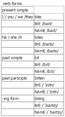 bite [bite bites bit biting bitten] verb, noun BrE [baɪt] NAmE [baɪt] verb (bitBrE [bɪt] ; NAmE [bɪt] , bit·tenBrE [ˈbɪtn] ; NAmE [ˈbɪtn] ) USE TEETH 1. intransitive, transitive to use your teeth to cut into or through sth • Does your dog bite? • Come here! I won't bite! (= you don't need to be afraid) •~ into/through sth She bit into a ripe juicy pear. •~ sb/sth She was bitten by the family dog. •Stop biting your nails! •~ off sth/sth off He bit off a large chunk of bread/He bit a large chunk of bread off. OF INSECT/SNAKE 2. intransitive, transitive to wound sb by making a small hole or mark in their skin • Most European spiders don't bite. •~ sb We were badly bitten by mosquitoes. OF FISH 3. intransitive if a fish bites, it takes food from the hook of a ↑fishing line and may get caught HAVE EFFECT 4. intransitive to have an unpleasant effect •The recession is beginning to bite. more at the hair of the dog that bit you at ↑hair, bite/snap sb's head off at ↑head n., once bitten twice shy at ↑once adv. Verb forms: Word Origin: Old English bītan, of Germanic origin; related to Dutch bijten and German beissen. Thesaurus: bite verb I, T •She bit into a ripe, juicy pear. chew • • munch • • crunch • • nibble • • gnaw • bite/chew/munch/crunch/gnaw through sth bite/chew/munch/crunch/nibble on sth bite/chew/munch/nibble/gnaw at sth Example Bank: •After two cold months, the coal shortage was beginning to bite. •As the recession bites harder, many small companies are going bankrupt. •He bit at his lower lip. •He bit off a chunk of bread. •She bit down on her bottom lip. •She bit into the apple. •The dog had bitten right through its rope. •The handcuffs bit deep into his wrist. •Their cat was badly bitten by a dog. •She was bitten by the dog. •Stop biting your nails. Idioms: ↑bite at the cherry ▪ ↑bite off more than you can chew ▪ ↑bite the bullet ▪ ↑bite the dust ▪ ↑bite the hand that feeds you ▪ ↑bite your lip ▪ ↑bite your tongue ▪ ↑bitten by something Derived: ↑bite back ▪ ↑bite into something ▪ ↑bite something back noun USING TEETH 1. countable an act of biting • The dog gave me a playful bite. • He has to wear a brace to correct his bite (= the way the upper and lower teeth fit together). FOOD 2. countable a small piece of food that you can bite from a larger piece • She took a couple of bites of the sandwich. • He didn't eat a bite of his dinner (= he ate nothing). 3. a ~ (to eat) singular (informal)a small amount of food; a small meal •How about a bite of lunch? •We just have time for a bite to eat before the movie. OF INSECT/ANIMAL 4. countable a wound made by an animal or insect • Dog bites can get infected. •a mosquito/snake bite STRONG TASTE 5. uncountable a pleasant strong taste • Cheese will add extra bite to any pasta dish. COLD 6. singular a sharp cold feeling •There's a bite in the air tonight. POWERFUL EFFECT 7. uncountable a quality that makes sth effective or powerful •The performance had no bite to it. •The sun had lost some of its bite by then. OF FISH 8. countable the act of a fish biting food on a hook •The fishermen waited all afternoon for a bite. see also ↑frostbite, ↑love bite, ↑sound bite more at sb's bark is worse than their bite at ↑bark n. Word Origin: Old English bītan, of Germanic origin; related to Dutch bijten and German beissen. Example Bank: •I got a lot of mosquito bites last night. •I took a bite from the apple. •She took a bite out of the slab of cake. •She tried to talk between bites. •We managed to grab a bite at the airport. •We managed to grab a bite at the theatre before the show started. •We'll have a bite to eat in town. •a bite from a poisonous snake •a quick bite of lunch •She took a huge bite out of the chocolate bar.