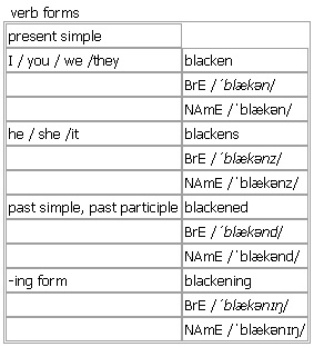 black·en [blacken blackens blackened blackening] BrE [ˈblækən] NAmE [ˈblækən] verb 1. transitive, intransitive ~ (sth) to make sth black; to become black •Their faces were blackened with soot. •Smoke had blackened the walls. •rows of blackened teeth 2. transitive ~ sb's name/reputation/character to say unpleasant things that give people a bad opinion of sb •He accused the newspaper of trying to blacken his name. Verb forms: Example Bank: •There was a row of brick houses, blackened by smoke.