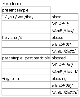 blood [blood bloods blooded blooding] noun, verb BrE [blʌd] NAmE [blʌd] noun 1. uncountable the red liquid that flows through the bodies of humans and animals • He lost a lot of blood in the accident. • Blood was pouring out of a cut on her head. •to give blood (= to have blood taken from you so that it can be used in the medical treatment of other people) •to draw blood (= to wound a person so that they lose blood) •a blood cell/sample •the blood supply to the brain •dried blood 2. -blooded (in adjectives)having the type of blood mentioned •cold-blooded reptiles see also ↑blue-blooded, ↑hot-blooded, ↑red-blooded 3. uncountable (formal)family origins • She is of noble blood. • There is some Polish blood on his father's side. 4. countable (old-fashioned, BrE)a rich and fashionable man •a young blood more at in cold blood at ↑cold adj., flesh and bloodyour (own) flesh and blood at ↑flesh n., freeze your blood at ↑freeze v., spill blood at ↑spill v., spit blood at ↑spit v., stir the blood at ↑stir v., sweat blood at ↑sweat v. Word Origin: Old English blōd, of Germanic origin; related to German Blut and Dutch bloed. Example Bank: •Blood oozed slowly from the corner of his mouth. •Blood spattered the seats of the vehicle. •Dried blood caked his hands. •He choked on his own blood after being shot in the throat. •He rubbed his limbs vigorously to get the blood circulating. •He shot them in cold blood. •He was a hot-headed warrior, always too quick to shed blood. •He was lying on the floor, covered in blood. •He worked to remove all traces of blood. •Her white blood cell count is slightly elevated. •His shirt was soaked in blood. •I doubt if I have a single drop of aristocratic blood in my veins. •I felt the blood coursing in my veins as I ran. •My handkerchief was soaked in blood from my nose. •Our blood ran cold at the thought of how easily we could have been killed. •Samples of blood were drawn using sterile syringes. •She'd lost a lot of blood and doctors decided to do a transfusion. •The blood drained from his face when I told him the news. •The blood drummed in her ears. •The blood rushed to her face as she realized her error. •The blood spread rapidly from where he lay. •The body lay in a pool of blood. •The dog's fur was caked in blood when we found him. •The heart pumps blood around the body. •The hospital appealed for more people to donate blood. •There was blood smeared down his shirt. •Traces of an illegal substance were found in his blood. •What blood group are you? •What blood type do you have? •animals with warm blood •There is some Polish blood on his father's side. Idioms: ↑bad blood ▪ ↑blood is thicker than water ▪ ↑blood, sweat and tears ▪ ↑have somebody's blood on your hands ▪ in your blood ▪ ↑like getting blood out of a stone ▪ ↑make somebody's blood boil ▪ ↑make somebody's blood run cold ▪ ↑new blood ▪ ↑out for somebody's blood ▪ ↑somebody's blood is up verb ~ sb (especially BrE) to give sb their first experience of an activity Verb forms: Word Origin: Old English blōd, of Germanic origin; related to German Blut and Dutch bloed.