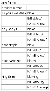 blow [blow blows blowed blowing] verb, noun, exclamation BrE [bləʊ] NAmE [bloʊ] verb (blewBrE [bluː] ; NAmE [bluː] blownBrE [bləʊn] ; NAmE [bloʊn] In sense 14 blowed is used for the past participle.) FROM MOUTH 1. intransitive, transitive to send out air from the mouth •+ adv./prep. You're not blowing hard enough! • The policeman asked me to blow into the breathalyser. •~ sth + adv./prep. He drew on his cigarette and blew out a stream of smoke. OF WIND 2. intransitive, transitive (+ adv./prep.) when the wind or a current of air blows, it is moving; when it blows, the wind is blowing • A cold wind blew from the east. • It was blowing hard. •It was blowing a gale (= there was a strong wind). MOVE WITH WIND/BREATH 3. intransitive, transitive to be moved by the wind, sb's breath, etc; to move sth in this way •+ adv./prep. My hat blew off. •+ adj. The door blew open. •~ sth + adv./prep. I was almost blown over by the wind. •She blew the dust off the book. •The ship was blown onto the rocks. •The bomb blast blew two passers-by across the street. •~ sth + adj. The wind blew the door shut. WHISTLE/INSTRUMENT 4. transitive, intransitive ~ (sth) if you blow a whistle, musical instrument, etc. or if a whistle, etc. blows, you produce a sound by blowing into the whistle, etc • The referee blew his whistle. •the sound of trumpets blowing YOUR NOSE 5. transitive ~ your nose to clear your nose by blowing strongly through it into a ↑tissue or ↑handkerchief A KISS 6. transitive ~ (sb) a kiss to kiss your hand and then pretend to blow the kiss towards sb SHAPE STH 7. transitive ~ sth to make or shape sth by blowing •to blow smoke rings •to blow bubbles (= for example, by blowing onto a thin layer of water mixed with soap) •to blow glass (= to send a current of air into melted glass to shape it) ELECTRICITY 8. intransitive, transitive ~ (sth) if a ↑fuse blows or you blow a ↑fuse, the electricity stops flowing suddenly because the ↑fuse (= a thin wire) has melted because the current was too strong TYRE 9. intransitive, transitive to break open or apart, especially because of pressure from inside; to make a tyre break in this way • The car spun out of control when a tyre blew. •The truck blew a tyre and lurched off the road. WITH EXPLOSIVES 10. transitive ~ sth to break sth open with ↑explosives •The safe had been blown by the thieves. SECRET 11. transitive ~ sth (informal)to make known sth that was secret •One mistake could blow your cover (= make your real name, job, intentions, etc. known). •We're going to blow his operation wide open. MONEY 12. transitive ~ sth (on sth) (informal)to spend or waste a lot of money on sth •He inherited over a million dollars and blew it all on drink and gambling. OPPORTUNITY 13. transitive ~ sth (informal)to waste an opportunity •She blew her chances by arriving late for the interview. •You had your chance and you blew it. EXCLAMATION 14. transitive ~ sb/sth (BrE, informal)used to show that you are annoyed, surprised or do not care about sth •Blow it! We've missed the bus. •Well, blow me down! I never thought I'd see you again. •I'm blowed if I'm going to (= I certainly will not) let him treat you like that. •Let's take a taxi and blow (= never mind) the expense. LEAVE SUDDENLY 15. transitive, intransitive ~ (sth) (NAmE, slang)to leave a place suddenly •Let's blow this joint. see also ↑whistle-blower, see blow/clear the cobwebs away at ↑cobweb, it's an ill wind (that blows nobody any good) at ↑ill adj., blow sb/sth to kingdom come at ↑kingdom, blow/sod that for a lark at ↑lark n., take/blow the lid off sth at ↑lid, puff and blow at ↑puff v., blow/knock sb's socks off at ↑sock n., see which way the wind is blowing at ↑way n. Verb forms: Word Origin: v. Old English blāwan Germanic German blähen ‘blow up, swell’ Indo-European Latin flare ‘blow’ n. late Middle English Thesaurus: blow verb 1. I, T •You're not blowing hard enough. puff • • breathe out • |formal exhale • Opp: suck blow out/puff/breathe out/exhale smoke blow/puff hard 2. I, T •My hat blew away in the wind. drift • • flutter • • fly • • flap • • waft • • wave • blow/drift/flutter/flap/waft/wave gently blow/drift/flutter/fly/flap/wave in the wind/breeze a flag flutters/flies/flaps/waves 3. T, I •The referee blew his whistle. sound • • play • • blast • • blare • • honk • • toot • blow/sound/blast/blare/honk/toot a horn a horn blows/sounds/blasts/blares/honks/toots blow/sound/play/blast a trumpet a trumpet blows/sounds/plays/blasts/blares blow/sound a whistle a whistle blows/sounds Synonyms: explode blow up • go off • burst • erupt • detonate These are all words that can be used when sth bursts apart violently, causing damage or injury. explode • to burst loudly and violently, causing damage; to make sth burst in this way: ▪ The jet smashed into a hillside and exploded. ◇ ▪ The bomb was exploded under controlled conditions. blow (sth) up • to be destroyed by an explosion; to destroy sth by an explosion: ▪ A police officer was killed when his car blew up. go off • (of a bomb) to explode; (of a gun) to be fired: ▪ The bomb went off in a crowded street. When used about guns, the choice of go off (instead of ‘be fired’) can suggest that the gun was fired by accident. burst • to break open or apart, especially because of pressure from inside; to make sth break in this way: ▪ That balloon's going to burst. erupt • (of a volcano) to throw out burning rocks and smoke; (of burning rocks and smoke) to be thrown out of a volcano. detonate • (rather formal) (of a bomb) to explode; to make a bomb explode: ▪ Two other bombs failed to detonate. a bomb explodes/blows up/goes off/bursts/detonates a car/plane/vehicle explodes/blows up a firework/rocket explodes/goes off Example Bank: •It's blowing a gale out there! •They won't com