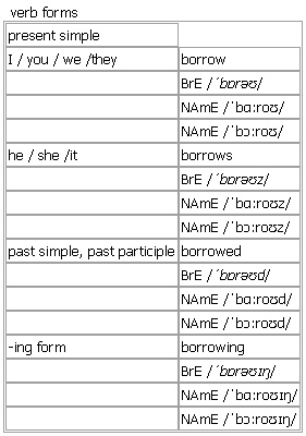 bor·row [borrow borrows borrowed borrowing] BrE [ˈbɒrəʊ] NAmE [ˈbɑːroʊ] NAmE [ˈbɔːroʊ] verb 1. transitive to take and use sth that belongs to sb else, and return it to them at a later time •~ sth Can I borrow your umbrella? •~ sth from sb/sth Members can borrow up to ten books from the library at any one time. • (BrE, informal)~ sth off sb I borrowed the DVD off my brother. compare ↑lend 2. transitive, intransitive to take money from a person or bank and agree to pay it back to them at a later time •~ sth (from sb/sth) How much did you have to borrow to pay for this? • She borrowed £2 000 from her parents. •~ (from sb/sth) I don't like to borrow from friends. •~ sth off sb (informal)I had to borrow the money off a friend. compare ↑lend 3. intransitive, transitive to take words, ideas, etc. from another language, person, etc. and use them, as your own •~ (from sb/sth) The author borrows heavily from Henry James. •~ sth (from sb/sth) Some musical terms are borrowed from Italian. Idiom: ↑on borrowed time Verb forms: Word Origin: Old English borgian ‘borrow against security’, of Germanic origin; related to Dutch and German borgen. Thesaurus: borrow verb T, I •Can I borrow your pen? beg • |informal, disapproving scrounge • Opp: lend borrow/beg/scrounge (sth) from sb borrow/scrounge sth off sb borrow/beg for money Which Word?: borrow / lend These two words are often confused. You borrow something from someone else, while they lend it to you: ▪ Can I borrow your pen? ◇ ▪ Can I borrow a pen from you? ◇ ▪ Here, I’ll lend you my pen. Example Bank: •His designs borrow freely from the architecture of ancient Egypt. •I borrowed £50 off my mum. •I'll borrow some coffee off the neighbours. •She borrowed £50 from her mother. •Can I borrow your pen? •I don't like to borrow from friends. •I'm borrowing the office laptop for the weekend. •You can borrow the book from the local library.