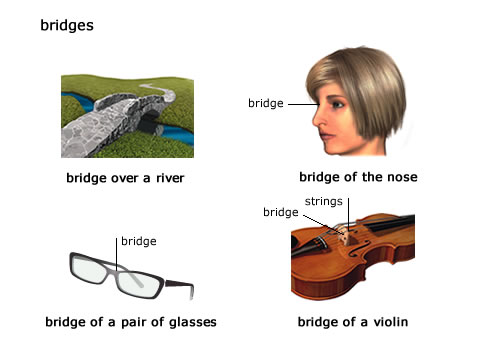 bridge [bridge bridges bridged bridging] noun, verb BrE [brɪdʒ] NAmE [brɪdʒ] noun OVER ROAD/RIVER 1. countable a structure that is built over a road, railway/railroad, river, etc. so that people or vehicles can cross from one side to the other • We crossed the bridge over the river Windrush.  see also ↑suspension bridge, ↑swing bridge CONNECTION 2. countable a thing that provides a connection or contact between two different things • The book serves as a bridge between ancient wisdom and modern science. • Cultural exchanges are a way of building bridges between countries. OF SHIP 3. countable, usually singular (usually the bridge)the part of a ship where the captain and other officers stand when they are controlling and steering the ship •Who was on the bridge when the collision took place? CARD GAME 4. uncountable a card game for two pairs of players who have to predict how many cards they will win. They score points if they succeed in winning that number of cards and lose points if they fail. see also ↑contract bridge OF NOSE 5. the ~ of sb's nose singular the hard part at the top of the nose, between the eyes OF GLASSES 6. countable the part of a pair of glasses that rests on your nose OF GUITAR/VIOLIN 7. countable a small piece of wood on a ↑guitar, ↑violin, etc. over which the strings are stretched FALSE TEETH 8. countable a false tooth or false teeth, held permanently in place by being fastened to natural teeth on either side see burn your bridges at ↑burn v., cross that bridge when you come to it at ↑cross v., it's (all) water under the bridge at ↑water n. Word Origin: n. senses 1 to 3 and n. senses 5 to 8 v. Old English brycg Germanic Dutch brug German Brücke n. sense 4 late 19th cent. Example Bank: •Cross the bridge and turn right into the town. •Floods washed away several bridges. •I enjoy a game of bridge occasionally. •It was windy driving over the bridge. •The new bridge will cross the Thames at this point. •The road goes under the old bridge. •The soldiers built a pontoon bridge across the Euphrates. •a bridge over the river •driving over a humpback bridge Idiom: ↑bridge the gap verb BUILD/FORM BRIDGE ~ sth to build or form a bridge over sth • The valley was originally bridged by the Romans. • A plank of wood bridged the stream. Verb forms: Word Origin: n. senses 1 to 3 and n. senses 5 to 8 v. Old English brycg Germanic Dutch brug German Brücke n. sense 4 late 19th cent.