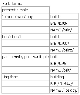 build [build builds built building] verb, noun BrE [bɪld] NAmE [bɪld] verb (built, builtBrE [bɪlt] ; NAmE [bɪlt] ) 1. transitive, intransitive to make sth, especially a building, by putting parts together •~ (sth) They have permission to build 200 new houses. • Robins build nests almost anywhere. •They're going to build on the site of the old power station. •~ sth of/in/from sth a house built of stone •apartment blocks built in brick and concrete •~ sth for sb They had a house built for them. •~ sb sth David built us a shed in the back yard. 2. transitive ~ sth to create or develop sth • She's built a new career for herself. • We want to build a better life. •This information will help us build a picture of his attacker. 3. intransitive (of a feeling)to become gradually stronger •The tension and excitement built gradually all day. see (build) castles in the air at ↑castle, Rome wasn't built in a day at ↑Rome Verb forms: Word Origin: Old English byldan, from bold, botl ‘dwelling’, of Germanic origin; related to ↑bower. Thesaurus: build verb 1. T, I •a house built of stone construct • • assemble • • put sth up • • set sth up • |formal erect • Opp: demolish build/construct sth from/out of/of sth build/construct/put up/erect a house/shelter/wall/fence build/construct a road/railway/railroad/tunnel/nest 2. T •She's built a new career for herself. make • • create • • form • • develop • |written, especially business evolve • build/make/create/form sth from out of sth build/create/form a picture of past societies build/develop/evolve a theory/framework/programme Synonyms: build construct • assemble • erect • put sth up These words all mean to make sth, especially by putting different parts together. build • to make sth, especially a building, by putting parts together: ▪ a house built of stone ◇ ▪ They're going to build on the site of the old power station. construct • [often passive] (rather formal) to build sth such as a road, building or machine assemble • (rather formal) to fit together all the separate parts of sth such as a piece of furniture or a machine: ▪ The cupboard is easy to assemble. erect • (formal) to build sth; to put sth in position and make it stand upright: ▪ Police had to erect barriers to keep crowds back. put sth up • to build sth or place sth somewhere: ▪ They're putting up new hotels in order to boost tourism in the area. to build/construct/erect/put up a house/wall to build/construct/erect/put up some shelves to build/construct/erect/put up a barrier/fence/shelter to build/construct/assemble a(n) engine/machine to build/construct a road/railway/railroad/tunnel to erect/put up a tent/statue/monument Example Bank: •David built us a shed in the backyard. •She's built a new career for herself. •They're going to build on the site of the old power station. Derived: ↑build on something ▪ ↑build somebody up ▪ ↑build something around something ▪ ↑build something in ▪ ↑build something into something ▪ ↑build something on ▪ ↑build something on something ▪ ↑build something onto something ▪ ↑build something up ▪ ↑build up ▪ ↑build up to something ▪ ↑build yourself up to something noun uncountable, countable, usually singular the shape and size of the human body •a man of average build Word Origin: Old English byldan, from bold, botl ‘dwelling’, of Germanic origin; related to ↑bower. Example Bank: •She is slight of build and very agile. •a small woman with a slim build •He was described as a man of average build. •He's heavier in build than his brother. •to be of average/medium/slight/slim/heavy/strong build
