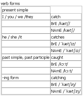 catch [catch catches caught catching] verb, noun BrE [kætʃ] NAmE [kætʃ] verb (caught, caughtBrE [kɔːt] ; NAmE [kɔːt] ) HOLD 1. transitive ~ sth to stop and hold a moving object, especially in your hands • She managed to catch the keys as they fell. • ‘Throw me over that towel, will you?’ ‘OK. Catch!’ •The dog caught the stick in its mouth. 2. transitive ~ sth to hold a liquid when it falls • The roof was leaking and I had to use a bucket to catch the drips. 3. transitive ~ sb/sth (+ adv./prep.) to take hold of sb/sth • He caught hold of her arm as she tried to push past him. CAPTURE 4. transitive ~ sb/sth to capture a person or an animal that tries or would try to escape • The murderer was never caught. • Our cat is hopeless at catching mice. •How many fish did you catch? SB DOING STH 5. transitive to find or discover sb doing sth, especially sth wrong •~ sb doing sth I caught her smoking in the bathroom. •You wouldn't catch me working (= I would never work) on a Sunday! •~ yourself doing sth She caught herself wondering whether she had made a mistake. •~ sb + adv./prep. He was caught with bomb-making equipment in his home. •Mark walked in and caught them at it (= in the act of doing sth wrong). •thieves caught in the act •You've caught me at a bad time (= at a time when I am busy). BUS/TRAIN/PLANE 6. transitive ~ sth to be in time for a bus, train, plane, etc. and get on it • We caught the 12.15 from Oxford. • I must go— I have a train to catch. BE IN TIME 7. transitive ~ sb/sth to be in time to do sth, talk to sb, etc •I caught him just as he was leaving the building. •I was hoping to catch you at home (= to telephone you at home when you were there). •The illness can be treated provided it's caught (= discovered) early enough. • (BrE)to catch the post (= post letters before the box is emptied) • (BrE, informal)Bye for now! I'll catch you later (= speak to you again later). SEE/HEAR 8. transitive ~ sth (informal, especially NAmE)to see or hear sth; to attend sth •Let's eat now and maybe we could catch a movie later. HAPPEN UNEXPECTEDLY 9. transitive ~ sb to happen unexpectedly and put sb in a difficult situation • His arrival caught me by surprise. • She got caught in a thunderstorm. ILLNESS 10. transitive to get an illness •~ sth to catch measles •~ sth from sb I think I must have caught this cold from you. BECOME STUCK 11. intransitive, transitive to become stuck in or on sth; to make sth become stuck •~ (in/on sth) Her dress caught on a nail. •~ sth (in/on sth) He caught his thumb in the door. HIT 12. transitive to hit sb/sth •~ sb/sth + adv./prep. The stone caught him on the side of the head. •~ sb sth + adv./prep. She caught him a blow on the chin. NOTICE 13. transitive ~ sth to notice sth only for a moment •She caught sight of a car in the distance. •He caught a glimpse of himself in the mirror. •I caught a look of surprise on her face. •He caught a whiff of her perfume. HEAR/UNDERSTAND 14. transitive ~ sth to hear or understand sth • Sorry, I didn't quite catch what you said. INTEREST 15. transitive ~ sb's interest, imagination, attention, etc. if sth catches your interest, etc, you notice it and feel interested in it SHOW ACCURATELY 16. transitive ~ sth to show or describe sth accurately Syn: ↑capture • The artist has caught her smile perfectly. LIGHT 17. transitive ~ sth if sth catches the light or the light catches it, the light shines on it and makes it shine too •The knife gleamed as it caught the light. THE SUN 18. transitive ~ the sun (informal)if you catch the sun, you become red or brown because of spending time in the sun BURN 19. transitive, intransitive ~ (fire) to begin to burn •The wooden rafters caught fire. •These logs are wet: they won't catch. IN CRICKET 20. transitive ~ sb to make a player unable to continue batting by catching the ball they have hit before it touches the ground more at (catch/throw sb) off balance at ↑balance n., be (caught) in a cleft stick at ↑cleft adj., the early bird catches the worm at ↑early adj., catch/take sb's fancy at ↑fancy n., catch/touch sb on the raw at ↑raw n., (caught/stuck) between a rock and a hard place at ↑rock n., be caught short at ↑short adj. Verb forms: Word Origin: Middle English (also in the sense ‘chase’): from Anglo-Norman French and Old Northern French cachier, variant of Old French chacier, based on Latin captare ‘try to catch’, from capere ‘take’. Thesaurus: catch verb 1. T •She caught the ball. grab • • seize • • take • • snatch • Opp: drop, Opp: throw catch/grab/seize/take hold of sb/sth 2. T •Police are trying to catch the culprits. capture • • arrest • • take • |formal apprehend • |informal bust • police catch/capture/arrest/take/apprehend/bust sb 3. T •How many fish did you catch? trap • • capture • catch/trap sth in sth catch/trap a/an bird/animal 4. T •I caught him smoking at work. find • • discover • • come across sb/sth • catch/find/discover/come across sb doing sth 5. T, no passive •catch a train get • • go by sth • |especially written take • Opp: miss catch the/get the/go by/take the bus/train/plane/boat catch/get a flight get a/go by/take a taxi 6. T •She caught my cold. get • • come down with sth • • develop • • have • • suffer from • |especially BrE, especially spoken have got • |formal contract • catch/get/develop/have/suffer from/have got/contract a/an disease/illness catch/get/come down with/have/suffer from/have got a bug/cold catch/get/come down with/have/suffer from/have got/contract the flu catch/get/have/suffer from/contract a virus/HIV/malaria Synonyms: see spot • catch • glimpse These words all mean to become aware of sb/sth by using your eyes, especially suddenly or when it is not easy to see them/it. see • to become aware of sb/sth by using your eyes: ▪ She looked for h
