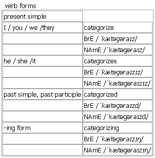 cat·egor·ize AW (BrE also-ise) [categorize categorizes categorized categorizing] BrE [ˈkætəɡəraɪz] NAmE [ˈkætəɡəraɪz] verb to put people or things into groups according to what type they are Syn: ↑classify •~ sb/sth Participants were categorized according to age. •~ sb/sth as sth His latest work cannot be categorized as either a novel or an autobiography. Derived Word: ↑categorization Verb forms: Example Bank: •Her work is difficult to categorize. •The employees are categorized as support personnel. •These factors can be conveniently categorized under three headings. •We categorize voters by their choice of newspaper. •categorizing people according to their jobs •Her latest work cannot be categorized as either a novel or an autobiography. •Participants were categorized according to age and sex. •Some types of investment risk are difficult to categorize. •Trade unions can be categorized into three main types.