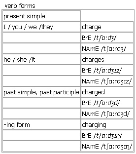 charge [charge charges charged charging] noun, verb BrE [tʃɑːdʒ] NAmE [tʃɑːrdʒ] noun MONEY 1. countable, uncountable ~ (for sth) the amount of money that sb asks for goods and services • We have to make a small charge for refreshments. •admission charges • Delivery is free of charge. 2. countable, uncountable (NAmE, informal) = ↑account (3), ↑charge account, ↑credit account •Would you like to put that on your charge? •‘Are you paying cash?’ ‘No, it'll be a charge.’ OF CRIME/STH WRONG 3. countable, uncountable an official claim made by the police that sb has committed a crime •criminal charges •a murder/an assault charge • He will be sent back to England to face a charge of (= to be on trial for) armed robbery. • They decided to drop the charges against the newspaper and settle out of court. •After being questioned by the police, she was released without charge. •a charge of theft/rape/attempted murder 4. countable a statement accusing sb of doing sth wrong or bad Syn: ↑allegation • She rejected the charge that the story was untrue. • Be careful you don't leave yourself open to charges of political bias. RESPONSIBILITY 5. uncountable a position of having control over sb/sth; responsibility for sb/sth • She has charge of the day-to-day running of the business. • They left the au pair in charge of the children for a week. •He took charge of the farm after his father's death. •I'm leaving the school in your charge. 6. countable (formal or humorous)a person that you have responsibility for and care for ELECTRICITY 7. countable, uncountable the amount of electricity that is put into a battery or carried by a substance •a positive/negative charge RUSH/ATTACK 8. countable a sudden rush or violent attack, for example by soldiers, wild animals or players in some sports •He led the charge down the field. EXPLOSIVE 9. countable the amount of ↑explosive needed to fire a gun or make an explosion see also ↑depth charge STRONG FEELING 10. singular the power to cause strong feelings •the emotional charge of the piano piece TASK 11. singular (formal)a task or duty •His charge was to obtain specific information. more at reverse the charges at ↑reverse v. Word Origin: Middle English (in the general senses ‘to load’ and ‘a load’), from Old French charger (verb), charge (noun), from late Latin carricare, carcare ‘to load’, from Latin carrus ‘wheeled vehicle’. Thesaurus: charge noun 1. C •There will be a small charge for refreshments. fee • • price • • rate • • terms • • dues • • toll • • fare • • rental • • cost • (a/the) charge/fee/price/rate/terms/dues/toll/fare/rental for sth at a charge/fee/price/rate/fare/rental/cost of… pay (a/the) charge/fee/price/rate/dues/toll/fare/rental/cost increase/reduce the charge/fee/price/rate/dues/toll/fare/rental/cost Charge or fee? Charge rather than fee is used for smaller services in less formal contexts: ✗ We have to make a small fee for refreshments.: •legal/school/professional fees However, when you visit a museum, etc. you pay an admission charge or admission/entrance fee (but not an ‘entrance charge‘. 2. C •The investigation led to criminal charges against three employees. accusation • • recrimination • |especially AmE indictment • • impeachment • (a/an) charge/accusation/recriminations/indictment against sb face a charge/an accusation/an indictment/impeachment make/deny a charge/an accusation Collocations: Criminal justice Breaking the law break/violate/obey/uphold the law be investigated/arrested/tried for a crime/a robbery/fraud be arrested/ (especially NAmE) indicted/convicted on charges of rape/fraud/(especially US) felony charges be arrested on suspicion of arson/robbery/shoplifting be accused of/be charged with murder/(especially NAmE) homicide/four counts of fraud face two charges of indecent assault admit your guilt/liability/responsibility (for sth) deny the allegations/claims/charges confess to a crime grant/be refused/be released on/skip/jump bail The legal process stand/await/bring sb to/come to/be on trial take sb to/come to/settle sth out of court face/avoid/escape prosecution seek/retain/have the right to/be denied access to legal counsel hold/conduct/attend/adjourn a hearing/trial sit on/influence/persuade/convince the jury sit/stand/appear/be put/place sb in the dock plead guilty/not guilty to a crime be called to/enter (BrE) the witness box take/put sb on the stand/(NAmE) the witness stand call/subpoena/question/cross-examine a witness give/hear the evidence against/on behalf of sb raise/withdraw/overrule an objection reach a unanimous/majority verdict return/deliver/record a verdict of not guilty/unlawful killing/accidental death convict/acquit the defendant of the crime secure a conviction/your acquittal lodge/file an appeal appeal (against)/challenge/uphold/overturn a conviction/verdict Sentencing and punishment pass sentence on sb carry/face/serve a seven-year/life sentence receive/be given the death penalty be sentenced to ten years (in prison/jail) carry/impose/pay a fine (of $3 000)/a penalty (of 14 years imprisonment) be imprisoned/jailed for drug possession/fraud/murder do/serve time/ten years be sent to/put sb in/be released from jail/prison be/put sb/spend X years on death row be granted/be denied/break (your) parole more collocations at ↑crime Synonyms: rate charge • fee • rent • fine • fare • toll • rental These are all words for an amount of money that is charged or paid for sth. rate • a fixed amount of money that is asked or paid for sth: ▪ a low hourly rate of pay ◇ ▪ interest rates charge • an amount of money that is asked for goods or services: ▪ an admission charge fee • (rather formal) an amount of money that you have to pay for professional advice or services, to go to a school or college, or to join an organization: ▪ legal fees ◇ ▪ an annual mem