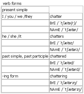 chat·ter [chatter chatters chattered chattering] verb, noun BrE [ˈtʃætə(r)] NAmE [ˈtʃætər] verb 1. intransitive ~ (away/on) (to sb) (about sth) to talk quickly and continuously, especially about things that are not important •They chattered away happily for a while. •The children chattered to each other excitedly about the next day's events. 2. intransitive (of teeth)to knock together continuously because you are cold or frightened •Her teeth chattered as she dressed. 3. intransitive (of birds or ↑monkeys)to make a series of short high sounds •The only sounds we could hear were the birds chattering in the trees. Verb forms: Word Origin: Middle English: imitative. Example Bank: •He chattered excitedly to his friends. •He chattered on happily for about half an hour. •We chattered about work. •chattering excitedly to her friends •The children chattered to each other excitedly about the next day's events. Idiom: ↑chattering classes noun uncountable 1. continuous rapid talk about things that are not important •Jane's constant chatter was beginning to annoy him. •idle chatter 2. a series of quick short high sounds that some animals make •the chatter of monkeys 3. a series of short sounds made by things knocking together •the chatter of teeth Word Origin: Middle English: imitative. Example Bank: •Her constant chatter was starting to annoy me. •I wish you'd stop wasting time in idle chatter. •She was full of chatter about her new friends. •Jane's constant chatter was beginning to annoy him.