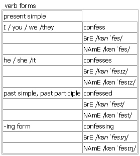 con·fess [confess confesses confessed confessing] BrE [kənˈfes] NAmE [kənˈfes] verb 1. intransitive, transitive to admit, especially formally or to the police, that you have done sth wrong or illegal •After hours of questioning, the suspect confessed. •~ to sth/to doing sth She confessed to the murder. •~ (that)… He confessed that he had stolen the money. •~ sth We persuaded her to confess her crime. 2. intransitive, transitive to admit sth that you feel ashamed or embarrassed about •~ sth She was reluctant to confess her ignorance. •~ to sth/to doing sth I must confess to knowing nothing about computers. •~ (that)… I confess (that) I know nothing about computers. •+ speech ‘I know nothing about them,’ he confessed. •~ yourself + adj. (formal)I confess myself bewildered by their explanation. see also ↑self-confessed 3. intransitive, transitive ~ (sth) (to sb) (especially in the Roman Catholic Church)to tell God or a priest about the bad things you have done so that you can say that you are sorry and be forgiven 4. transitive ~ sb (of a priest)to hear sb confess their ↑sins (= the bad things they have done) Verb forms: Word Origin: late Middle English: from Old French confesser, from Latin confessus, past participle of confiteri ‘acknowledge’, from con- (expressing intensive force) + fateri ‘declare, avow’. Synonyms: admit acknowledge • recognize • concede • confess These words all mean to agree, often unwillingly, that sth is true. admit • to agree, often unwillingly, that sth is true: ▪ It was a stupid thing to do, I admit. acknowledge • (rather formal) to accept that sth exists, is true or has happened: ▪ She refuses to acknowledge the need for reform. recognize • to admit or be aware that sth exists or is true: ▪ They recognized the need to take the problem seriously. concede • (rather formal) to admit, often unwillingly, that sth is true or logical: ▪ He was forced to concede (that) there might be difficulties. admit or concede? When sb admits sth, they are usually agreeing that sth which is generally considered bad or wrong is true or has happened, especially when it relates to their own actions. When sb concedes sth, they are usually accepting, unwillingly, that a particular fact or statement is true or logical. confess • (rather formal) to admit sth that you feel ashamed or embarrassed about: ▪ She was reluctant to confess her ignorance. to admit/acknowledge/recognize/concede/confess that… to admit/confess to sth to admit/concede/confess sth to sb to admit/acknowledge/recognize the truth to admit/confess your mistakes/ignorance Example Bank: •I must confess that I didn't have much faith in her ideas. •She confessed to me that she had known his true identity for some time. •I must confess to knowing nothing about computers. •They had confessed their sins and done their penance.