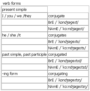 con·ju·gate [conjugate conjugates conjugated conjugating] BrE [ˈkɒndʒəɡeɪt] NAmE [ˈkɑːndʒəɡeɪt] verb (grammar) 1. transitive ~ sth to give the different forms of a verb, as they vary according to ↑number, ↑person, tense, etc. 2. intransitive (of a verb)to have different forms, showing ↑number, ↑person, tense, etc •How does this verb conjugate? compare ↑decline Verb forms: Word Origin: late 15th cent. (as an adjective): from Latin conjugat- ‘yoked together’, from the verb conjugare, from con- ‘together’ + jugum ‘yoke’.