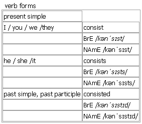 con·sist AW [consist consists consisted consisting] BrE [kənˈsɪst] NAmE [kənˈsɪst] verb