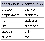 con·tinu·ous BrE [kənˈtɪnjuəs] NAmE [kənˈtɪnjuəs] adjective 1. happening or existing for a period of time without interruption • Recovery after the accident will be a continuous process that may take several months. • Stop smoking and you will see a continuous improvement in your health. •She was in continuous employment until the age of sixty-five. •The rain has been continuous since this morning. 2. spreading in a line or over an area without any spaces •a continuous line of traffic • Rain was falling outside in a continuous silver curtain. 3. (informal)repeated many times Syn: ↑continual • For four days the town suffered continuous attacks. Continual is much more frequent in this meaning. 4. (grammar) = ↑progressive •the continuous tenses Derived Word: ↑continuously Word Origin: mid 17th cent.: from Latin continuus ‘uninterrupted’, from continere ‘hang together’ (from con- ‘together with’ + tenere ‘hold’) + ↑-ous. Thesaurus: continuous [continuous continuously] adj. 1. •It was a week of almost continuous sunshine. continual • • unbroken • • uninterrupted • • endless • • perpetual • • never-ending • • persistent • • round-the-clock • • non-stop • |disapproving relentless • • incessant • Opp: intermittent a/an continuous/uninterrupted/endless/never-ending/relentless/incessant flow of sth a/an continuous/unbroken/uninterrupted/endless/never-ending succession/series (a/an) continuous/continual/relentless/endless/never-ending struggle Continuous or continual? Continuous is more frequent and has a wider range of uses than continual. Continual is used especially to describe states of mind or body; collocates include state, fear, pain and delight. 2. •The soldiers suffered continuous attacks. continual • • constant • • persistent • • frequent • • regular • • habitual • |especially written perpetual • continuous/continual/constant/persistent/frequent/regular/habitual use/attacks a continuous/continual/constant/persistent/frequent/perpetual problem a continuous/continual/constant/frequent/perpetual source of sth Which word? Persistent is often used to talk about medical problems or problems in society; perpetual is used to talk about annoying personal habits. Continuous and continual are used more in spoken English and less formal contexts. Synonyms: continuous / continual These adjectives are frequently used with the following nouns: Continuous describes something that continues without stopping. Continual usually describes an action that is repeated again and again. The difference between these two words is now disappearing. In particular, continual can also mean the same as continuous and is used especially about undesirable things: ▪ Life was a continual struggle for them. However, continuous is much more frequent in this sense. Example Bank: •Awards are based on continuous assessment of course work as well as a final examination. •Do the exercise in one continuous flowing motion. •Experiments were conducted in the continuous daylight of the Arctic summer. •He watched television as if it was one continuous programme. •I could hear a faint continuous noise. •It was a week of almost continuous sunshine. •It was the longest period of continuous growth in the company's history. •Progress in learning a language is continuous but uneven. •She retired after 25 years' continuous service with the company. •The company said the reasons for closure were poor margins and continuous losses. •The soldiers suffered continuous attacks for four days. •The woollen mill has been in continuous production since the 18th century. •These policies are vital for continuous improvement in economic performance. •You need to have been in continuous employment for at least two years. •a persistent/perpetual/continual/continuous problem