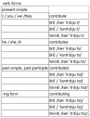 con·trib·ute AW [contribute contributes contributed contributing] BrE [kənˈtrɪbjuːt] BrE [ˈkɒntrɪbjuːt] NAmE [kənˈtrɪbjuːt] verb 1. transitive, intransitive to give sth, especially money or goods, to help sb/sth •~ sth (to/towards sth) We contributed £5 000 to the earthquake fund. •~ (to/towards sth) Would you like to contribute to our collection? •Do you wish to contribute? 2. intransitive ~ (to sth) to be one of the causes of sth • Medical negligence was said to have contributed to her death. • Human error may have been a contributing factor. 3. intransitive, transitive to increase, improve or add to sth •~ to sth Immigrants have contributed to British culture in many ways. •~ sth to sth This book contributes little to our understanding of the subject. 4. transitive, intransitive to write things for a newspaper, magazine, or a radio or television programme; to speak during a meeting or conversation, especially to give your opinion •~ sth (to sth) She contributed a number of articles to the magazine. •~ (to sth) He contributes regularly to the magazine ‘New Scientist’. •We hope everyone will contribute to the discussion. Verb forms: Word Origin: mid 16th cent.: from Latin contribut- ‘brought together, added’, from the verb contribuere, from con- ‘with’ + tribuere ‘bestow’. Thesaurus: contribute verb I, T •People contributed generously to the earthquake fund. donate • • give • |informal chip in (sth) • contribute/donate/give (sth) to sth contribute/donate/give cash/a sum contribute/donate/give/chip in £10/$1000, etc. Contribute or donate? Contribute suggests that a number of people are all giving money, food, etc. to a charity or fund. Donate places the emphasis on the individual. You can donate, but not contribute, blood. Language Bank: cause X causes Y ▪ Childhood obesity can cause ▪ / lead to ▪ long-term health problems. ▪ Changes in lifestyle and diet over the last twenty years have caused ▪ / led to ▪ / resulted in ▪ a sharp increase in childhood obesity. ▪ Several factors, including changes in diet and lifestyle, have contributed to ▪ the increase in childhood obesity. ▪ Research suggests that fast food and soft drinks directly contribute to ▪ childhood obesity. ▪ Genetics, lifestyle and diet are ▪ all important factors ▪ in cases of childhood obesity. ▪ Even small changes in lifestyle and diet can bring about ▪ significant weight loss. Language Banks at ↑because of, ↑consequently, ↑therefore Example Bank: •His research has contributed enormously to our understanding of this disease. •I would like to contribute to the church restoration fund. •Many people contributed generously to the appeal. •Parental involvement contributes significantly to children's learning. •Several factors might contribute to the development of the disease. •Students are encouraged to contribute articles to the university magazine. •The company contributed $50 000 towards/toward training costs. •These images could potentially contribute to the development of eating disorders. •Unemployment contributes directly to homelessness. •a situation where husband and wife contribute equally to the family budget •a talented photographer who contributed regularly to ‘The Face’ •countries that contribute disproportionately to global warming •people who want to contribute positively to their communities •The writer personally contributed £5 000 to the earthquake fund.