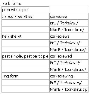 cork·screw [corkscrewcorkscrewscorkscrewedcorkscrewing] noun, verb BrE [ˈkɔːkskruː] NAmE [ˈkɔːrkskruː] noun a tool for pulling ↑corks from bottles. Most corkscrews have a handle and a long twisted piece of metal for pushing into the ↑cork.