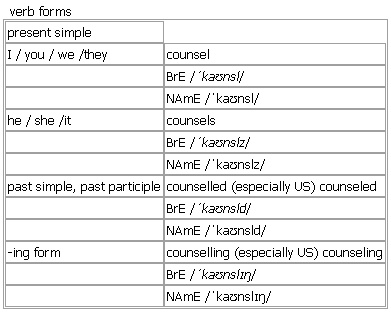 coun·sel [counsel counsels counselled counseled counselling counseling] noun, verb BrE [ˈkaʊnsl] NAmE [ˈkaʊnsl] noun uncountable, countable 1. (formal)advice, especially given by older people or experts; a piece of advice •Listen to the counsel of your elders. •In the end, wiser counsels prevailed. 2. (law)a lawyer or group of lawyers representing sb in court •to be represented by counsel •the counsel for the defence/prosecution •defence/prosecuting counsel •The court then heard counsel for the dead woman's father. see also king's/queen's counsel Word Origin: Middle English: via Old French counseil (noun), conseiller (verb), from Latin consilium ‘consultation, advice’, related to consulere ‘take counsel’. Compare with ↑council. Collocations: Criminal justice Breaking the law break/violate/obey/uphold the law be investigated/arrested/tried for a crime/a robbery/fraud be arrested/ (especially NAmE) indicted/convicted on charges of rape/fraud/(especially US) felony charges be arrested on suspicion of arson/robbery/shoplifting be accused of/be charged with murder/(especially NAmE) homicide/four counts of fraud face two charges of indecent assault admit your guilt/liability/responsibility (for sth) deny the allegations/claims/charges confess to a crime grant/be refused/be released on/skip/jump bail The legal process stand/await/bring sb to/come to/be on trial take sb to/come to/settle sth out of court face/avoid/escape prosecution seek/retain/have the right to/be denied access to legal counsel hold/conduct/attend/adjourn a hearing/trial sit on/influence/persuade/convince the jury sit/stand/appear/be put/place sb in the dock plead guilty/not guilty to a crime be called to/enter (BrE) the witness box take/put sb on the stand/(NAmE) the witness stand call/subpoena/question/cross-examine a witness give/hear the evidence against/on behalf of sb raise/withdraw/overrule an objection reach a unanimous/majority verdict return/deliver/record a verdict of not guilty/unlawful killing/accidental death convict/acquit the defendant of the crime secure a conviction/your acquittal lodge/file an appeal appeal (against)/challenge/uphold/overturn a conviction/verdict Sentencing and punishment pass sentence on sb carry/face/serve a seven-year/life sentence receive/be given the death penalty be sentenced to ten years (in prison/jail) carry/impose/pay a fine (of $3 000)/a penalty (of 14 years imprisonment) be imprisoned/jailed for drug possession/fraud/murder do/serve time/ten years be sent to/put sb in/be released from jail/prison be/put sb/spend X years on death row be granted/be denied/break (your) parole more collocations at ↑crime More About: lawyers Lawyer is a general term for a person who is qualified to advise people about the law, to prepare legal documents for them and/or to represent them in a court of law. In England and Wales, a lawyer who is qualified to speak in the higher courts of law is called a barrister. In Scotland a barrister is called an advocate. In NAmE attorney is a more formal word used for a lawyer and is used especially in job titles: ▪ district attorney. Counsel is the formal legal word used for a lawyer who is representing someone in court: ▪ counsel for the prosecution. Solicitor is the BrE term for a lawyer who gives legal advice and prepares documents, for example when you are buying a house, and sometimes has the right to speak in a court of law. In NAmE solicitor is only used in the titles of some lawyers who work for the government: ▪ Solicitor General. Example Bank: •He instructed his counsel to file bankruptcy proceedings. •He is there to give you counsel on all matters. •He worked for the committee as legislative counsel on issues of crime policy. •His counsel argued that he had not intended to harm the women. •Lawyers do not usually interrupt opposing counsel during closing arguments. •My solicitor will brief the senior counsel. •She is general counsel for the American Bankers Association. •She is lead counsel for the plaintiffs in the case. •The accused was represented by a leading counsel. •The witness was cross-examined by the prosecuting counsel. •They were denied legal counsel or the right to call witnesses in their defence. •the counsel for the defence/defense. •The court then heard counsel for the dead woman's father. •Williams is the leading counsel for the victims' groups. •the lead counsel Idioms: ↑counsel of despair ▪ ↑counsel of perfection ▪ ↑keep your own counsel verb (-ll-, especially US -l-) 1. ~ sb to listen to and give support or professional advice to sb who needs help •Therapists were brought in to counsel the bereaved. 2. (formal)to advise sb to do sth •~ sth Most experts counsel caution in such cases. •~ sb to do sth He counselled them to give up the plan. Verb forms: Word Origin: Middle English: via Old French counseil (noun), conseiller (verb), from Latin consilium ‘consultation, advice’, related to consulere ‘take counsel’. Compare with ↑council. Example Bank: •She counselled them to give up the plan.