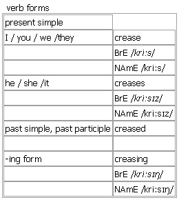 crease [crease creases creased creasing] noun, verb BrE [kriːs] NAmE [kriːs] noun 1. an untidy line that is made in cloth or paper when it is pressed or crushed •She smoothed the creases out of her skirt. •a shirt made of crease-resistant material 2. a neat line that you make in sth, for example when you fold it •trousers with a sharp crease in the legs 3. a line in the skin, especially on the face •creases around the eyes 4. (in ↑cricket)a white line on the ground near each ↑wicket that marks the position of the ↑bowler and the ↑batsman •He spent six hours at the crease (= he was batting for six hours). Word Origin: late 16th cent.: probably a variant of ↑crest. Example Bank: •She had lots of deep creases at the corners of her eyes. •She smoothed the creases from the tablecloth. •There were a lot of creases in her skirt. •a sharp crease in his trousers •He ironed out the creases in his shirt. •My mother always irons creases into my trousers. Derived Word: ↑creased Derived: ↑crease somebody up ▪ ↑crease up verb 1. transitive, intransitive ~ (sth) to make lines on cloth or paper by folding or crushing it; to develop lines in this way •Pack your suit carefully so that you don't crease it. 2. transitive, intransitive ~ (sth) to make lines in the skin; to develop lines in the skin •A frown creased her forehead. •Her face creased into a smile. Verb forms: Word Origin: late 16th cent.: probably a variant of ↑crest. Example Bank: •Her clothes were badly creased. •His shirt had creased a bit in the suitcase. •This material creases very easily. •His clothes had got badly creased. •Pack your suit carefully so that you don't crease it. Example Bank: •I can't wear this blouse. It's creased.