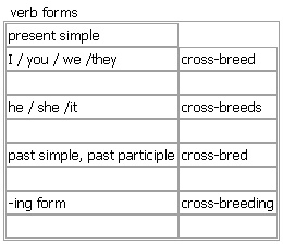 ˈcross-breed [cross-breed cross-breeds cross-bred cross-breeding] verb, noun BrE NAmE verb transitive, intransitive ~ (sth) to make an animal or a plant breed with a different breed; to breed with an animal or a plant of a different breed •cross-bred sheep Verb forms:  Derived Word: ↑cross-breeding noun an animal or a plant that is a result of ↑cross-breeding compare ↑hybrid
