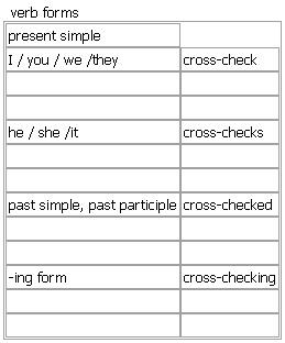 ▪ I. ˌcross-ˈcheck [cross-check cross-checks cross-checked cross-checking] BrE NAmE verb to make sure that information, figures etc. are correct by using a different method or system to check them •~ sth Cross-check your answers with a calculator. •~ sth against sth Baggage should be cross-checked against the names of individual passengers. Verb forms:  ▪ II. ˈcross-check [cross-check cross-checks cross-checked cross-checking] BrE NAmE noun Main entry: ↑cross-checkderived