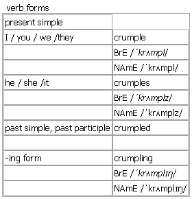 crum·ple [crumple crumples crumpled crumpling] BrE [ˈkrʌmpl] NAmE [ˈkrʌmpl] verb  1. transitive, intransitive ~ (sth) (up) (into sth) to crush sth into folds; to become crushed into folds •She crumpled the letter up into a ball and threw it on the fire. •This material crumples very easily. 2. intransitive ~ (up) if your face crumples, you look sad and disappointed, as if you might cry •Her face crumpled up and she burst into tears. 3. intransitive ~ (up) to fall down in an uncontrolled way because you are injured, unconscious, drunk, etc. Syn: ↑collapse •He crumpled up in agony. Derived Word: ↑crumpled Verb forms: Word Origin: Middle English: from obsolete crump ‘make ’ or ‘ become curved’, from Old English crump ‘bent, crooked’, of West Germanic origin; related to German krumm. Thesaurus: crumple verb T, I •He wore a crumpled linen suit. rumple • • crease • • scrunch • • crush • • ruffle • crumple/scrunch/ruffle sth up a bed/sheets/bedclothes is/are crumpled/rumpled fabric/material crumples/creases