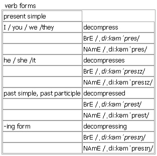 de·com·press [decompress decompresses decompressed decompressing] BrE [ˌdiːkəmˈpres] NAmE [ˌdiːkəmˈpres] verb 1. intransitive, transitive ~ (sth) to have the air pressure in sth reduced to a normal level or to reduce it to its normal level 2. transitive ~ sth (computing)to return files, etc. to their original size after they have been compressed Opp: ↑compress Verb forms: