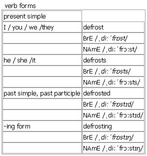 de·frost [defrost defrosts defrosted defrosting] BrE [ˌdiːˈfrɒst] NAmE [ˌdiːˈfrɔːst] verb 1. intransitive, transitive to become or make sth warmer, especially food, so that it is no longer frozen •It will take about four hours to defrost. •~ sth Make sure you defrost the chicken completely before cooking. 2. transitive, intransitive ~ (sth) when you defrost a fridge/refrigerator or ↑freezer, or when it defrosts, you remove the ice from it compare ↑de-ice, ↑melt, ↑thaw, ↑unfreeze 3. transitive ~ sth (NAmE)to remove ice from the surface of a car's windows Derived Word: ↑defroster Verb forms:
