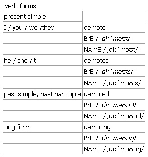 de·mote [demote demotes demoted demoting] BrE [ˌdiːˈməʊt] NAmE [ˌdiːˈmoʊt] verb often passive ~ sb (from sth) (to sth) to move sb to a lower position or rank, often as a punishment Opp: ↑promote Derived Word: ↑demotion Verb forms: Word Origin: late 19th cent.: from ↑de- ‘down’ + a shortened form of ↑promote.