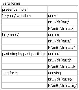deny AW [deny denies denied denying] BrE [dɪˈnaɪ] NAmE [dɪˈnaɪ] verb (de·nies, deny·ing, de·nied, de·nied) 1. to say that sth is not true •~ sth to deny a claim/a charge/an accusation • The spokesman refused either to confirm or deny the reports. •~ (that)… She denied (that) there had been any cover-up. •There's no denying (the fact) that quicker action could have saved them. •it is denied that… It can't be denied that we need to devote more resources to this problem. •~ doing sth He denies attempting to murder his wife. 2. ~ sth to refuse to admit or accept sth • She denied all knowledge of the incident. • The department denies responsibility for what occurred. 3. (formal)to refuse to allow sb to have sth that they want or ask for •~ sb sth They were denied access to the information. •~ sth to sb Access to the information was denied to them. 4. ~ yourself (sth) (formal)to refuse to let yourself have sth that you would like to have, especially for moral or religious reasons Verb forms: Word Origin: Middle English: from Old French deni-, stressed stem of deneier, from Latin denegare, from de- ‘formally’ + negare ‘say no’. Thesaurus: deny verb T •He has denied the accusations. contradict • |formal disclaim • • repudiate • |especially journalism refute • Opp: admit, Opp: confirm deny/contradict/repudiate/refute a report/suggestion deny/repudiate/refute a claim deny/disclaim knowledge/responsibility flatly deny/contradict sth Word Family: deny verb denial noun undeniable adjective undeniably adverb Example Bank: •Children could be compelled to work on the farm, effectively denying them schooling. •He has categorically denied being involved in the fraud. •He has consistently denied murdering his estranged wife. •I know it was you I saw, so there's no use trying to deny it. •If anyone accuses me I shall simply deny it. •No one would deny that there is a very great need for change. •The country's government systematically denies its citizens basic rights to free expression. •There is no denying the fact that she is an excellent scholar. •They were cruelly denied victory by a header from Reece. •They were cruelly denied victory by an injury-time strike from Owen. •You can't deny that it seems a very attractive idea. •You cannot deny this opportunity to me. •He denied accusations of corruption and mismanagement. •It can't be denied that we need to devote more resources to this problem. •She denied that there had been any cover-up. •There's no denying the fact that quicker action could have saved them.