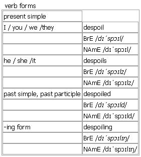 de·spoil [despoil despoils despoiled despoiling] BrE [dɪˈspɔɪl] NAmE [dɪˈspɔɪl] verb ~ sth (of sth) (literary) to steal sth valuable from a place; to make a place less attractive by damaging or destroying it Syn: ↑plunder Verb forms: Word Origin: Middle English: from Old French despoillier, from Latin despoliare ‘rob, plunder’ (from spolia ‘spoil’).