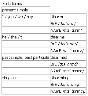 dis·arm [disarm disarms disarmed disarming] BrE [dɪsˈɑːm] NAmE [dɪsˈɑːrm] verb 1. transitive ~ sb to take a weapon or weapons away from sb •Most of the rebels were captured and disarmed. 2. intransitive (of a country or a group of people)to reduce the size of an army or to give up some or all weapons, especially nuclear weapons •The government was reluctant to disarm. 3. transitive ~ sb to make sb feel less angry or critical •He disarmed her immediately by apologizing profusely. •The best way to disarm your critics is to make them laugh. compare ↑arm Verb forms: Word Origin: late Middle English: from Old French desarmer.