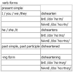 dis·heart·en [dishearten disheartens disheartened disheartening] BrE [dɪsˈhɑːtn] NAmE [dɪsˈhɑːrtn] verb ~ sb to make sb lose hope or confidence Syn: ↑discourage •Don't let this defeat dishearten you. Derived Words: ↑disheartened ▪ ↑disheartening Verb forms: Example Bank: •Even the experts don't know. I find it very disheartening. •What makes it so disheartening is that nobody cares what happens. Example Bank: •I am disheartened by their attitude.