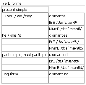 dis·man·tle [dismantle dismantles dismantled dismantling] BrE [dɪsˈmæntl] NAmE [dɪsˈmæntl] verb 1. ~ sth to take apart a machine or structure so that it is in separate pieces •I had to dismantle the engine in order to repair it. •The steel mill was dismantled piece by piece. 2. ~ sth to end an organization or system gradually in an organized way •The government was in the process of dismantling the state-owned industries. Derived Word: ↑dismantling Verb forms: Word Origin: late 16th cent. (in the sense ‘destroy the defensive capability of a fortification’): from Old French desmanteler, from des- (expressing reversal) + manteler ‘fortify’ (from Latin mantellum ‘cloak’).
