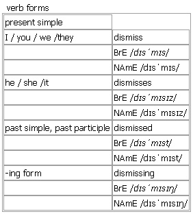 dis·miss [dismiss dismisses dismissed dismissing] BrE [dɪsˈmɪs] NAmE [dɪsˈmɪs] verb 1. to decide that sb/sth is not important and not worth thinking or talking about Syn: wave aside •~ sb/sth I think we can safely dismiss their objections. •~ sb/sth as sth Vegetarians are no longer dismissed as cranks. •He dismissed the opinion polls as worthless. •The suggestion should not be dismissed out of hand (= without thinking about it). 2. to put thoughts or feelings out of your mind •~ sth Dismissing her fears, she climbed higher. •~ sb/sth from sth He dismissed her from his mind. 3. ~ sb (from sth) to officially remove sb from their job Syn: ↑fire, Syn: ↑sack • She claims she was unfairly dismissed from her post. 4. ~ sb to send sb away or allow them to leave • At 12 o'clock the class was dismissed. 5. ~ sth (law)to say that a trial or legal case should not continue, usually because there is not enough evidence •The case was dismissed. 6. ~ sb (in ↑cricket)to end the ↑innings of a player or team Verb forms: Word Origin: late Middle English: from medieval Latin dismiss-, variant of Latin dimiss- ‘sent away’, from the verb dimittere. Thesaurus: dismiss verb 1. T •I think we can safely dismiss their objections. brush sb/sth aside • • shrug sth off/aside • • set sth aside • |informal laugh sth off • |formal discount • |written banish • dismiss/brush sth aside/shrug sth off/set sth aside/discount sth as irrelevant, unimportant, etc. dismiss/brush aside/shrug off/laugh off/discount a suggestion dismiss/brush aside/laugh off/discount/banish a fear 2. T, usually passive •She was unfairly dismissed from her job. fire • • lay sb off • • let sb go • |BrE make sb redundant • |especially BrE, informal sack • • give sb the sack • |formal discharge • |BrE, journalism axe • |AmE ax • Opp: appoint dismiss sb/fire sb/lay sb off/make sb redundant/sack sb/give sb the sack/discharge sb from a job dismiss/fire/lay off/axe staff/workers/employees make staff/workers/employees redundant let staff employees go Example Bank: •Former members of the band have dismissed talk of a comeback. •He dismissed her suggestion out of hand. •He was summarily dismissed from his job. •His plan was dismissed outright by his friends. •It is easy to dismiss him as nothing more than an old fool. •It is no longer possible to dismiss the link between climate change and carbon emissions. •It was not easy to dismiss the matter from his thoughts. •She contemptuously dismissed their complaints. •She could not dismiss the possibility of his guilt. •She dismissed their arguments as irrelevant. •She tried to dismiss the idea from her mind. •Such reports are routinely dismissed as hysteria. •The court ruled that Ms Hill had been unfairly dismissed. •The minister has dismissed all the allegations against him. •‘Case dismissed!’ •Judges have to state their reasons for dismissing a case. •She claims she was unfairly dismissed from her position. •The suggestion should not be dismissed out of hand.