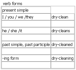 ˌdry-ˈclean [dry-clean dry-cleans dry-cleaned dry-cleaning] BrE NAmE (also clean) verb ~ sth to clean clothes using chemicals instead of water •This garment must be dry-cleaned only. Derived Word: ↑dry-cleaning See also: ↑clean Verb forms: Synonyms: clean wash • rinse • cleanse • dry-clean These words all mean to remove dirt from sth, especially by using water and/or soap. clean • to remove dirt or dust from sth, especially by using water or chemicals: ▪ The villa is cleaned twice a week. ◇ ▪ Have you cleaned your teeth? ◇ ▪ This coat is filthy. I'll have it cleaned ▪ (= dry-cleaned). wash • to remove dirt from sth using water and usually soap: ▪ He quickly washed his hands and face. ◇ ▪ These jeans need washing. rinse • to remove dirt, etc. from sth using clean water only, not soap; to remove the soap from sth with clean water after washing it: ▪ Make sure you rinse all the soap out. cleanse • to clean your skin or a wound. dry-clean • to clean clothes using chemicals instead of water. to clean/wash/rinse/cleanse sth in/with sth to clean/wash/rinse sth from sth to clean/wash/cleanse a wound to clean/wash the car/floor to wash/rinse your hair to have sth cleaned/washed/dry-cleaned
