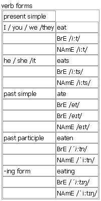 eat [eat eats ate eating eaten] BrE [iːt] NAmE [iːt] verb (ateBrE [et] ; [eɪt] ; NAmE [eɪt] , eatenBrE [ˈiːtn] ; NAmE [ˈiːtn] ) 1. intransitive, transitive to put food in your mouth, chew it and swallow it • I was too nervous to eat. • She doesn't eat sensibly (= doesn't eat food that is good for her). •~ sth I don't eat meat. •Would you like something to eat? •I couldn't eat another thing (= I have had enough food). 2. intransitive to have a meal • Where shall we eat tonight? • We ate at a pizzeria in town. more at have your cake and eat it (too) at ↑cake n., (a case of) dog eat dog at ↑dog n. Idioms: ↑I could eat a horse ▪ ↑I'll eat my hat ▪ ↑eat humble pie ▪ ↑eat like a horse ▪ ↑eat out of your hand ▪ ↑eat somebody alive ▪ ↑eat somebody out of house and home ▪ ↑eat your heart out ▪ ↑eat your heart out! ▪ ↑eat your words ▪ ↑eat, drink and be merry ▪ ↑what's eating him, etc? Derived: ↑eat away at somebody ▪ ↑eat into something ▪ ↑eat out ▪ ↑eat somebody up ▪ ↑eat something away ▪ ↑eat something up ▪ ↑eat up See also: ↑eat crow Verb forms: Word Origin: Old English etan, of Germanic origin; related to Dutch eten and German essen, from an Indo-European root shared by Latin edere and Greek edein. Thesaurus: eat verb 1. I, T •Eat your dinner. have • • swallow • • taste • • finish • |informal wolf • • stuff • |formal consume • |especially written devour • |BrE, especially spoken tuck in/tuck into sth • |technical ingest • eat/swallow/wolf down/stuff yourself with/consume/devour/tuck into your food eat/have/finish/devour/tuck into a meal eat/have/finish/wolf/tuck into your lunch/dinner eat/have/taste/consume some meat/fruit 2. I •We ate at the new restaurant in town. formal dine • • lunch • • breakfast • |written feast • eat/dine/lunch/breakfast at a place dine/lunch/breakfast/feast on a particular food eat/dine out/well Collocations: Diet and exercise Weight put on/gain/lose weight/a few kilos/a few pounds watch/control/struggle with your weight be/become seriously overweight/underweight be/become clinically/morbidly obese achieve/facilitate/promote/stimulate weight loss slim down to 70 kilos/(BrE) 11 stone/(especially NAmE) 160 pounds combat/prevent/tackle/treat obesity develop/have/suffer from/struggle with/recover from anorexia/bulimia/an eating disorder be on/go on/follow a crash/strict diet have/suffer from a negative/poor body image have/develop a positive/healthy body image Healthy eating eat a balanced diet/healthily/sensibly get/provide/receive adequate/proper nutrition contain/get/provide essential nutrients/vitamins/minerals be high/low in calories/fat/fibre/(especially US) fiber/protein/vitamin D/Omega-3 fatty acids contain (no)/use/be full of/be free from additives/chemical preservatives/artificial sweeteners avoid/cut down on/cut out alcohol/caffeine/fatty foods stop/give up/ (especially NAmE) quit smoking Exercise (BrE) take regular exercise do moderate/strenuous/vigorous exercise play football/hockey/tennis go cycling/jogging/running go to/visit/ (especially NAmE) hit/work out at the gym strengthen/tone/train your stomach muscles contract/relax/stretch/use/work your lower-body muscles build (up)/gain muscle improve/increase your stamina/energy levels/physical fitness burn/consume/expend calories Staying healthy be/get/keep/stay healthy/in shape/(especially BrE) fit lower your cholesterol/blood pressure boost/stimulate/strengthen your immune system prevent/reduce the risk of heart disease/high blood pressure/diabetes/osteoporosis reduce/relieve/manage/combat stress enhance/promote relaxation/physical and mental well-being Example Bank: •Barton did not feel very hungry and ate sparingly. •Come on, eat up your lunch. •Do you have anything to eat? •Do you want to grab a bite to eat? •Everyone happily ate the huge meal. •Go and get yourself something to eat and drink. •He had not eaten properly for days. •He'd barely eaten any breakfast. •He's eating us out of house and home. •He's not eating enough. •I'm trying to eat more healthily. •Let's go eat. •She doesn't eat sensibly. •She's very thin but she eats like a horse! •Try and eat something. It will do you good. •We ate very well most of the time. •We eventually sat down to eat at 8.30 p.m. •We went out to eat for a Chinese New Year celebration. •You look good enough to eat! •I can't be bothered to cook. Shall we eat out tonight? •I couldn't eat another thing. •I don't eat meat. •You can eat really well without spending a fortune.
