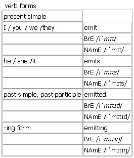emit [emit emits emitted emitting] BrE [iˈmɪt] NAmE [iˈmɪt] verb (-tt-)~ sth (formal) to send out sth such as light, heat, sound, gas, etc •The metal container began to emit a clicking sound. •Sulphur gases were emitted by the volcano. Verb forms: Word Origin: early 17th cent.: from Latin emittere, from e- (variant of ex-) ‘out of’ + mittere ‘send’.