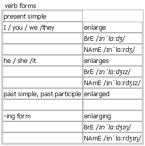 en·large [enlarge enlarges enlarged enlarging] BrE [ɪnˈlɑːdʒ] NAmE [ɪnˈlɑːrdʒ] verb 1. transitive, intransitive ~ (sth) to make sth bigger; to become bigger •There are plans to enlarge the recreation area. •Reading will enlarge your vocabulary. 2. transitive, usually passive ~ sth to make a bigger copy of a photograph or document •We're going to have this picture enlarged. Derived Word: ↑enlarged Derived: ↑enlarge on something Verb forms: Word Origin: Middle English (formerly also as inlarge): from Old French enlarger, from en- (expressing a change of state) + large ‘large’. Example Bank: •The castle was enlarged considerably in the fifteenth century. •The gallery is seeking to enlarge its holdings of Danish art. •The images were enlarged to the size of a wall of a room. •Symptoms may include a sore throat and enlarged glands. •The little blisters enlarge and eventually burst to form ulcers. •We're going to have this picture enlarged.