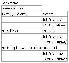 es·teem [esteem esteems esteemed esteeming] noun, verb BrE [ɪˈstiːm] NAmE [ɪˈstiːm] noun uncountable (formal) great respect and admiration; a good opinion of sb •She is held in high esteem by her colleagues. •Over the years, he has earned our affection and esteem. •Please accept this small gift as a token of our esteem. see also ↑self-esteem Word Origin: Middle English (as a noun in the sense ‘worth, reputation’): from Old French estime (noun), estimer (verb), from Latin aestimare ‘to estimate’. The verb was originally in the Latin sense, also ‘appraise’ (compare with ↑estimate), used figuratively to mean ‘assess the merit of’. Current senses date from the 16th cent. Example Bank: •He had lost all of his personal esteem. •He is held in the highest esteem by all who know him. •Her work has been steadily gaining critical esteem in recent years. •I have great esteem for you. •I needed to do it for my own personal esteem. •It is easy for children to lose their self-esteem. •Recent reviews of her work have raised her esteem. •She had earned the esteem of everyone in the town. •The school's aim is to build the self-esteem of the children. •We parted with expressions of mutual esteem. •We would like to offer you this gift as a mark of our esteem. •the high public esteem now enjoyed by the armed forces •the level of social esteem accorded to doctors •the public's esteem for the president •the status of teachers in the public esteem verb (formal) (not used in the progressive tenses) 1. usually passive ~ sb/sth to respect and admire sb/sth very much •a highly esteemed scientist •Many of these qualities are esteemed by managers. •He was esteemed as a dedicated and imaginative scholar. •This rose is esteemed among connoisseurs for its colour and scent. 2. ~ sb/sth + noun (old-fashioned, formal)to think of sb/sth in a particular way •She was esteemed the perfect novelist. Verb forms: Word Origin: Middle English (as a noun in the sense ‘worth, reputation’): from Old French estime (noun), estimer (verb), from Latin aestimare ‘to estimate’. The verb was originally in the Latin sense, also ‘appraise’ (compare with ↑estimate), used figuratively to mean ‘assess the merit of’. Current senses date from the 16th cent. Example Bank: •She was a highly esteemed scientist.