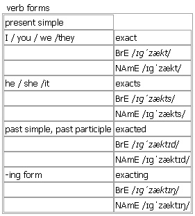exact [exact exacts exacted exacting] adjective, verb BrE [ɪɡˈzækt] NAmE [ɪɡˈzækt] adjective 1. correct in every detail Syn: ↑precise • She gave an exact description of the attacker. •an exact copy/replica of the painting • We need to know the exact time the incident occurred. •What were his exact words? •She's in her mid-thirties— thirty-six to be exact. •The colours were an exact match. •He started to phone me at the exact moment I started to phone him (= at the same time). •The two men were exact contemporaries at university. •Her second husband was the exact opposite of her first (= completely different). 2. (of people)very accurate and careful about details Syn: ↑meticulous, Syn: ↑precise 3. (of a science)using accurate measurements and following set rules Syn: ↑precise •Assessing insurance risk can never be an exact science. Word Origin: late Middle English (as a verb): from Latin exact- ‘completed, ascertained, enforced’, from the verb exigere, from ex- ‘thoroughly’ + agere ‘perform’. The adjective dates from the mid 16th cent. and reflects the Latin exactus ‘precise’. Thesaurus: exact adj. 1. usually before noun •She gave an exact description of the attacker. precise • • accurate • • specific • Opp: inexact, Opp: approximate, Opp: rough exact/precise/accurate/specific instructions/details (a/an) exact/precise/accurate answer/description/measurements an exact/accurate picture/copy the exact/precise time Exact, precise or accurate? A description that is not very exact/precise lacks details; if it is not very accurate it has details, but they are wrong. 2. •I had the exact same problem as you. very • • actual • • precise • Opp: approximate the exact/very/actual/precise moment sb's exact/very/actual words the exact/actual/precise nature of sth the exact/very same sth Example Bank: •He started to phone me at the exact moment I started to phone him. •I had the exact same problem as you when I first started. •She's in her mid-thirties— 36, to be exact. •This is an exact copy of the original document. Derived Words: ↑exaction ▪ ↑exactness verb (formal) 1. ~ sth (from sb) to demand and get sth from sb •She was determined to exact a promise from him. 2. to make sth bad happen to sb •~ sth He exacted (= took) a terrible revenge for their treatment of him. •~ sth from sb Stress can exact a high price from workers (= can affect them badly). Verb forms: Word Origin: late Middle English (as a verb): from Latin exact- ‘completed, ascertained, enforced’, from the verb exigere, from ex- ‘thoroughly’ + agere ‘perform’. The adjective dates from the mid 16th cent. and reflects the Latin exactus ‘precise’. Example Bank: •No doubt they will exact payment in due course.