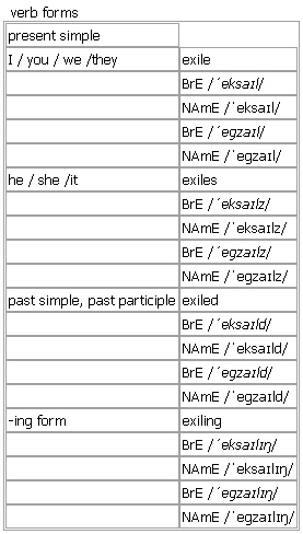 exile [exile exiles exiled exiling] noun, verb BrE [ˈeksaɪl] NAmE [ˈeksaɪl] BrE [ˈeɡzaɪl] NAmE [ˈeɡzaɪl] noun 1. uncountable, singular the state of being sent to live in another country that is not your own, especially for political reasons or as a punishment •to be/live in exile •to be forced/sent into exile •to go into exile •a place of exile •He returned after 40 years of exile. 2. countable a person who chooses, or is forced to live away from his or her own country •political exiles •a tax exile (= a rich person who moves to another country where taxes are lower) Word Origin: Middle English: the noun partly from Old French exil ‘banishment’ and partly from Old French exile ‘banished person’; the verb from Old French exiler; all based on Latin exilium ‘banishment’, from exul ‘banished person’. Example Bank: •Dante died in exile from Florence. •He still hopes to return from exile one day. •He went into exile after the overthrow of the government. •Many spent decades in labour camps or in internal exile. •She had spent 40 years in exile. •They are in tax exile from the UK. •They joined the many other Armenians living in exile. •a political exile living in London •his exile to America •the story of the emperor's return from exile •a tax exile •to be/live in exile •to go/be forced/be sent into exile verb usually passive ~ sb (from…) to force sb to leave their country, especially for political reasons or as a punishment; to send sb into ↑exile •the party's exiled leaders Verb forms: Word Origin: Middle English: the noun partly from Old French exil ‘banishment’ and partly from Old French exile ‘banished person’; the verb from Old French exiler; all based on Latin exilium ‘banishment’, from exul ‘banished person’. Example Bank: •He was effectively exiled after a failed bid for power. •He was exiled for his beliefs. •He was exiled to Siberia. •The family was exiled from France. •Dante, the poet, was exiled from his home in Florence. •Exiled opposition leaders have made an appeal to the international community. •The government decided to exile him to the colonies.