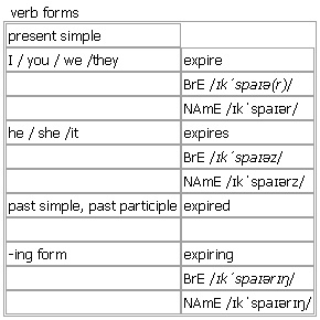 ex·pire [expire expires expired expiring] BrE [ɪkˈspaɪə(r)] NAmE [ɪkˈspaɪər] verb